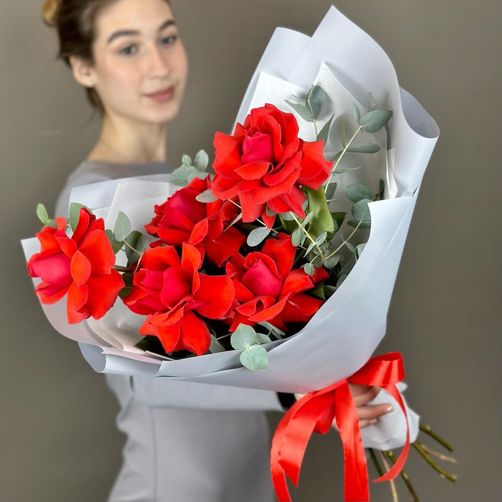 Эвкалипт – 1 шт.Лента атласная – 1 шт.Французская роза – 5 шт.Тишью белое – 1 шт.Дизайнерская упаковка – 1 шт.