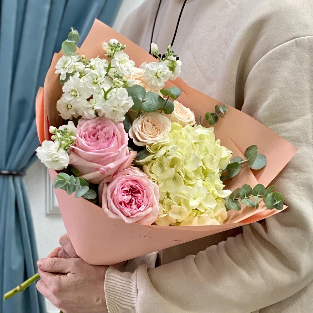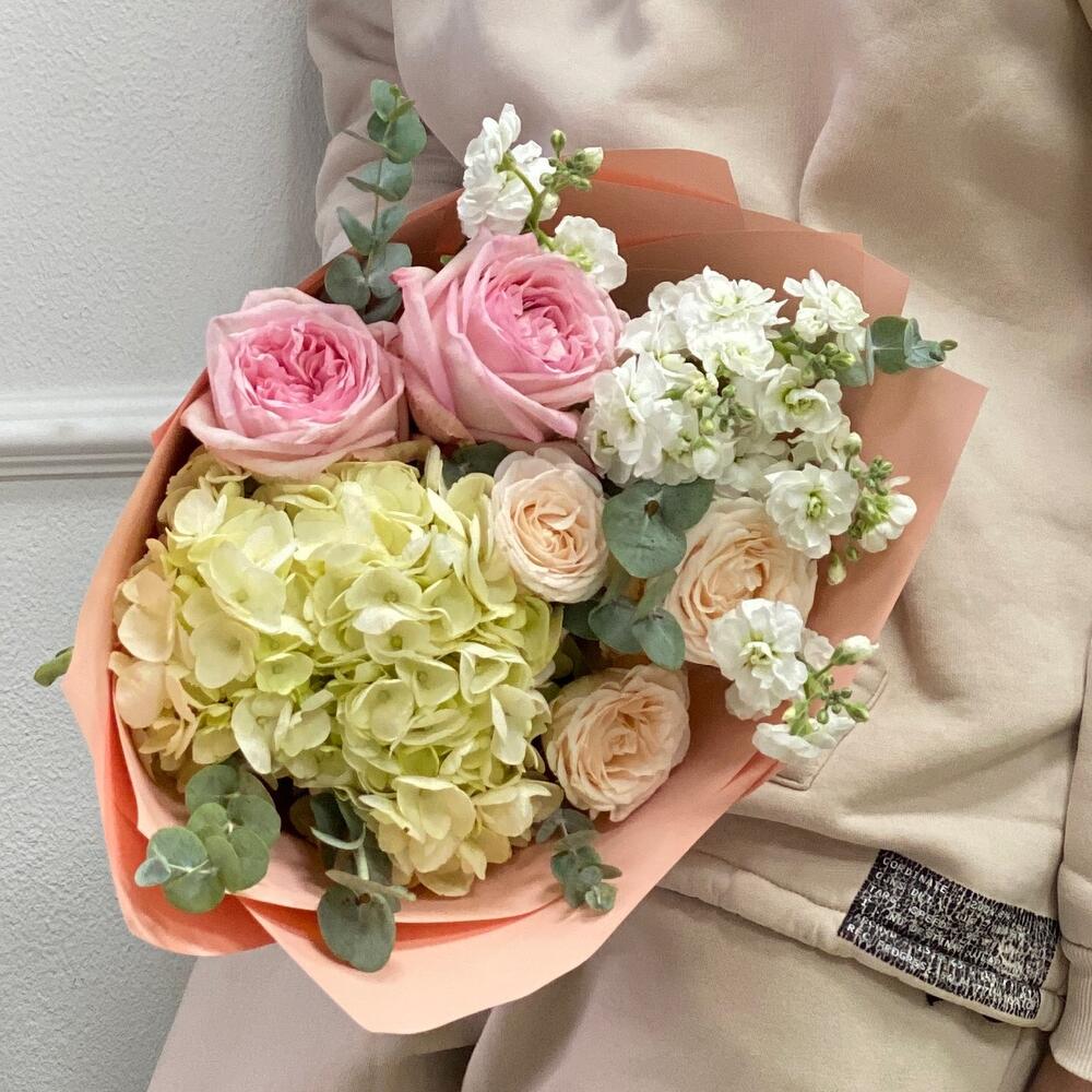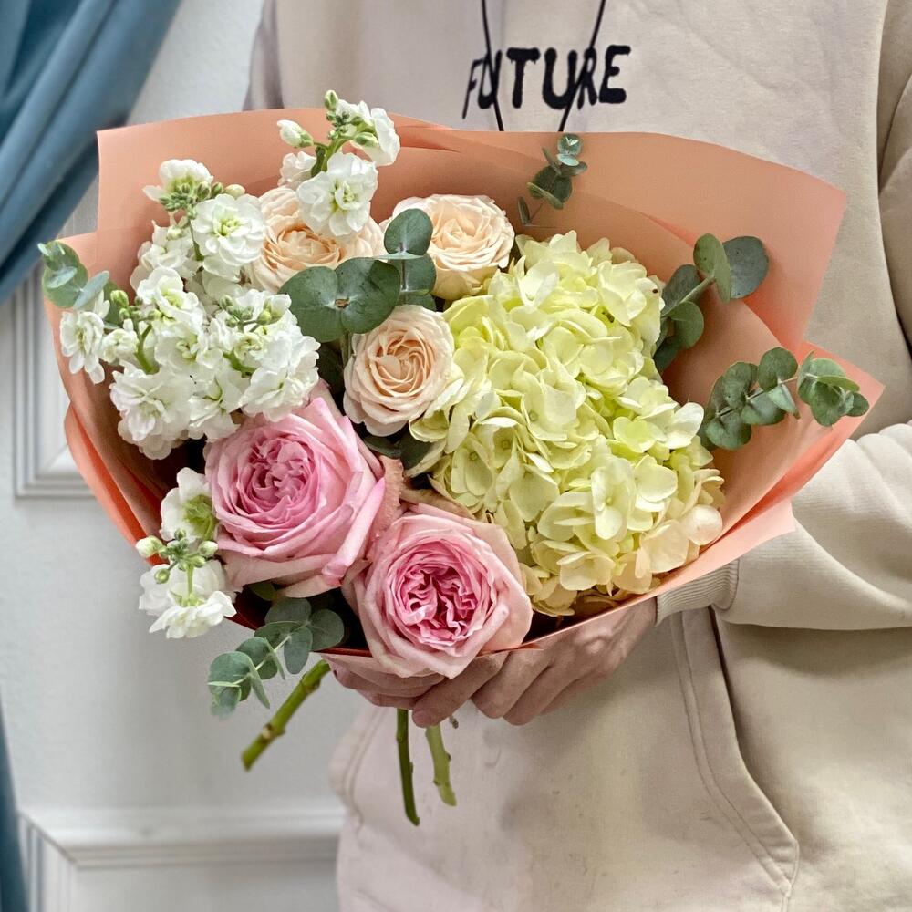Гортензия – 1 шт.Эвкалипт – 2 шт.Роза кустовая бежевая – 1 шт.Пленка матовая – 1 шт.маттиола кустовая белая – 1 шт.роза пинк охара(ароматная) – 2 шт.