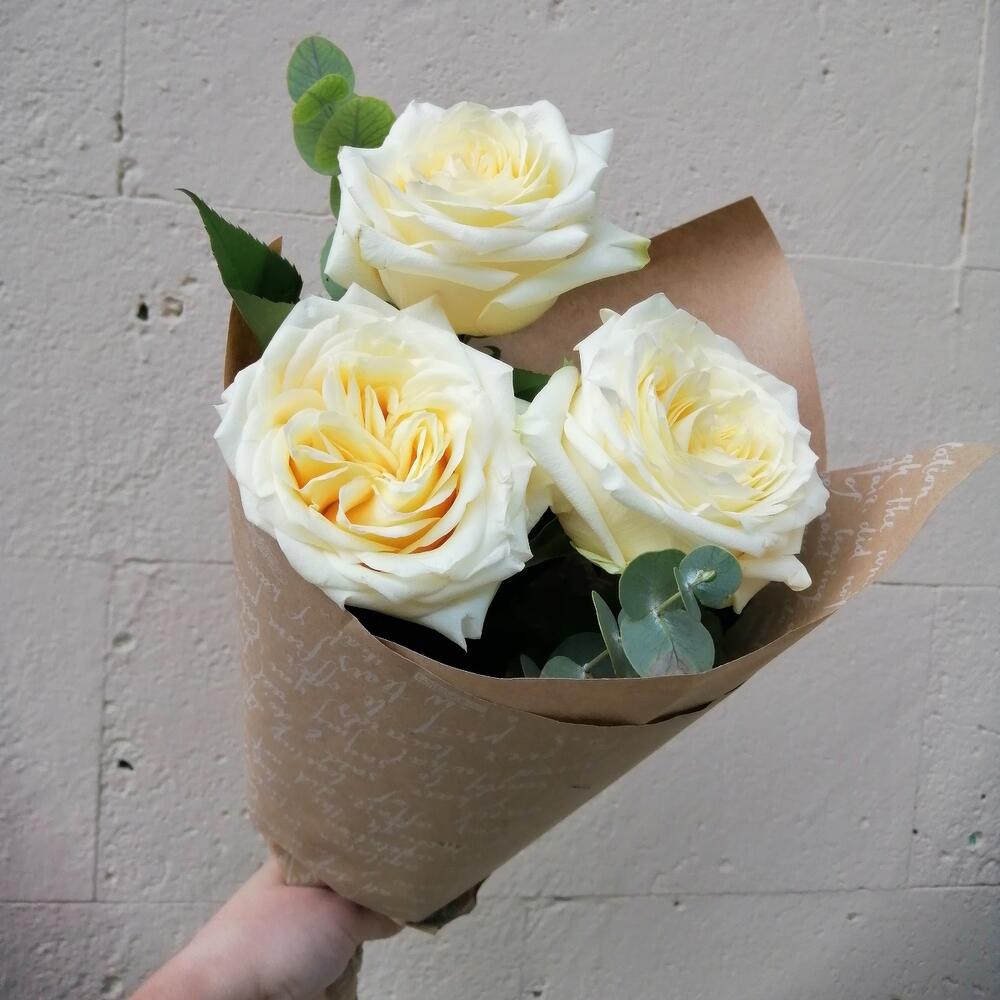 роза кендллайт – 3 шт.Эвкалипт – 1 шт.Упаковка крафт – 1 шт.Лента – 1 шт.