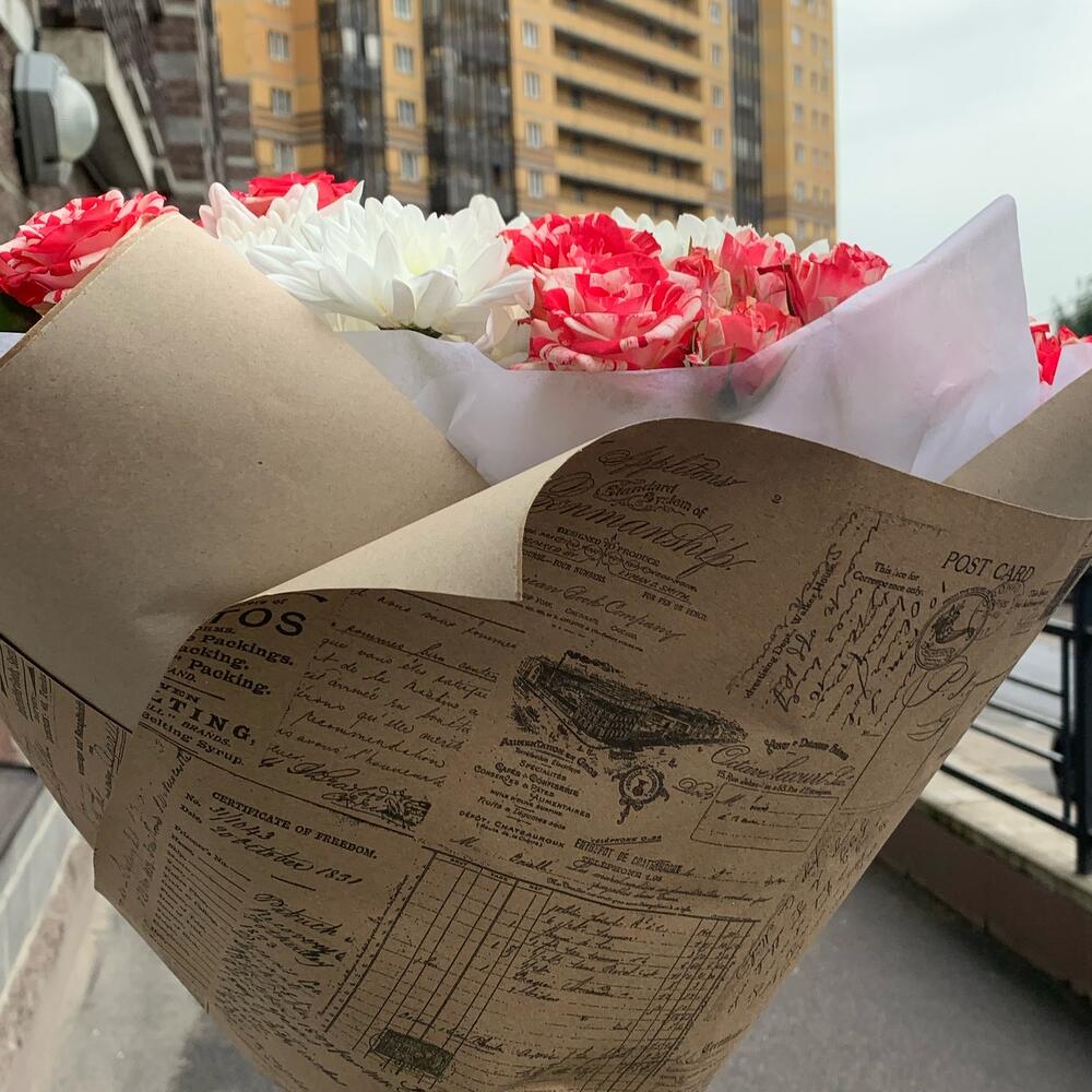 Кустовая роза – 7 шт.Хризантема кустовая – 8 шт.Упаковка тишью – 1 шт.Упаковка крафт – 1 шт.