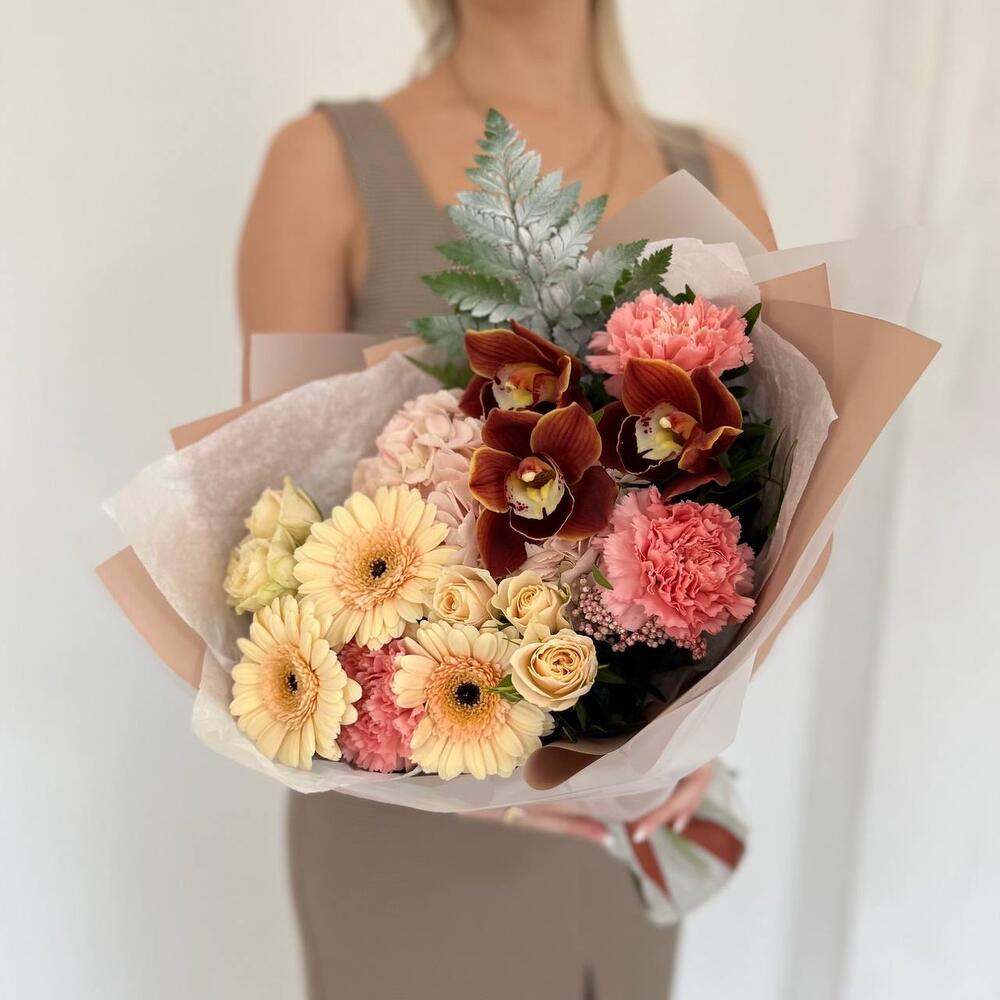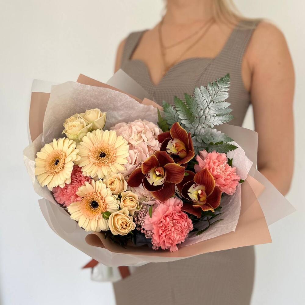 Гортензия – 1 шт.Озотамнус – 1 шт.Папоротник – 1 шт.Роза кустовая – 2 шт.Гербера – 3 шт.Диантус – 3 шт.орхидея – 3 шт.Дизайнерская упаковка – 3 шт.