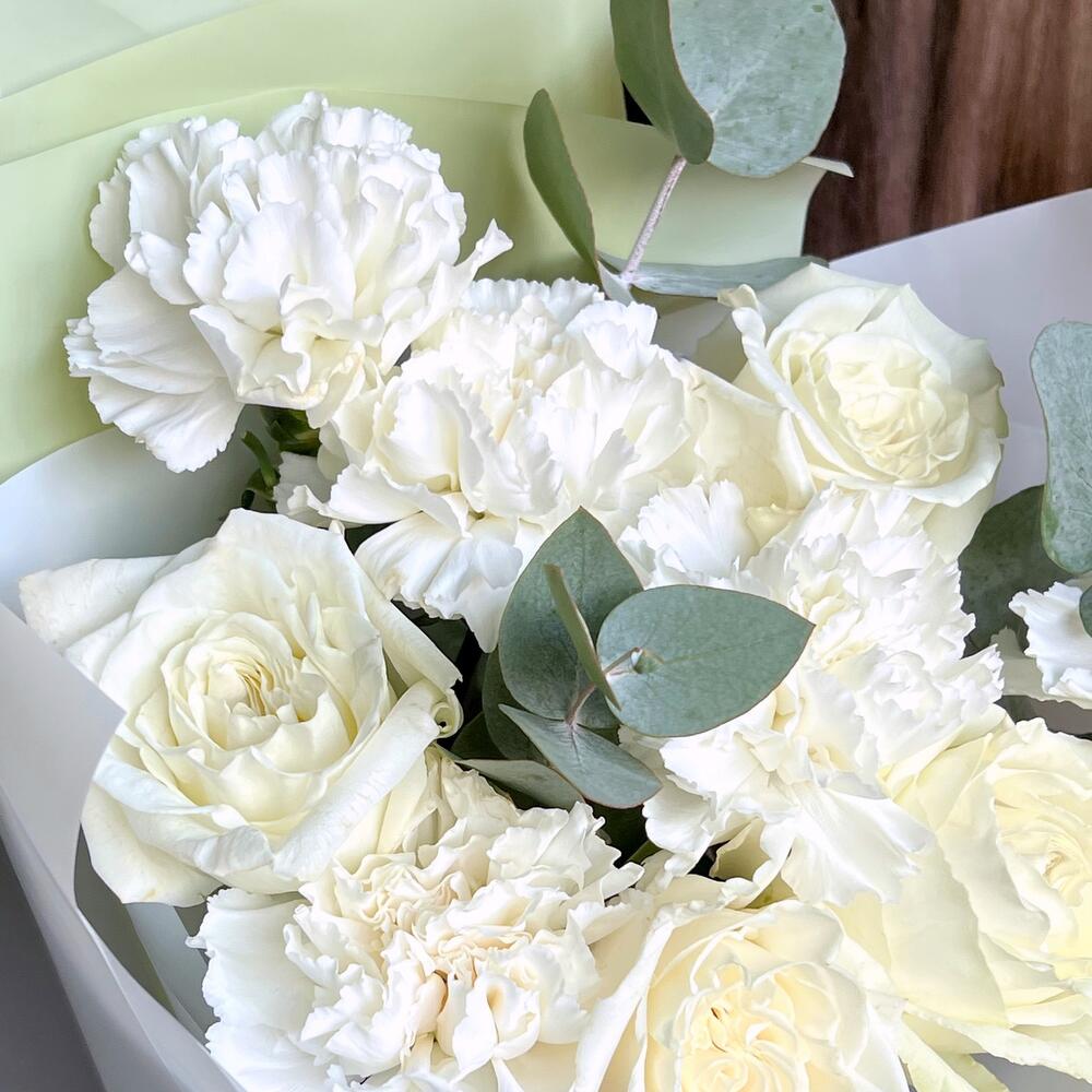 Букет из роз, эвкалипта и гвоздики