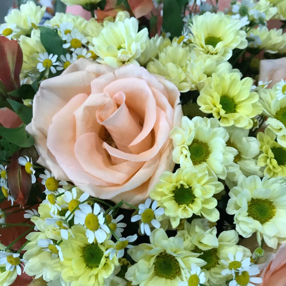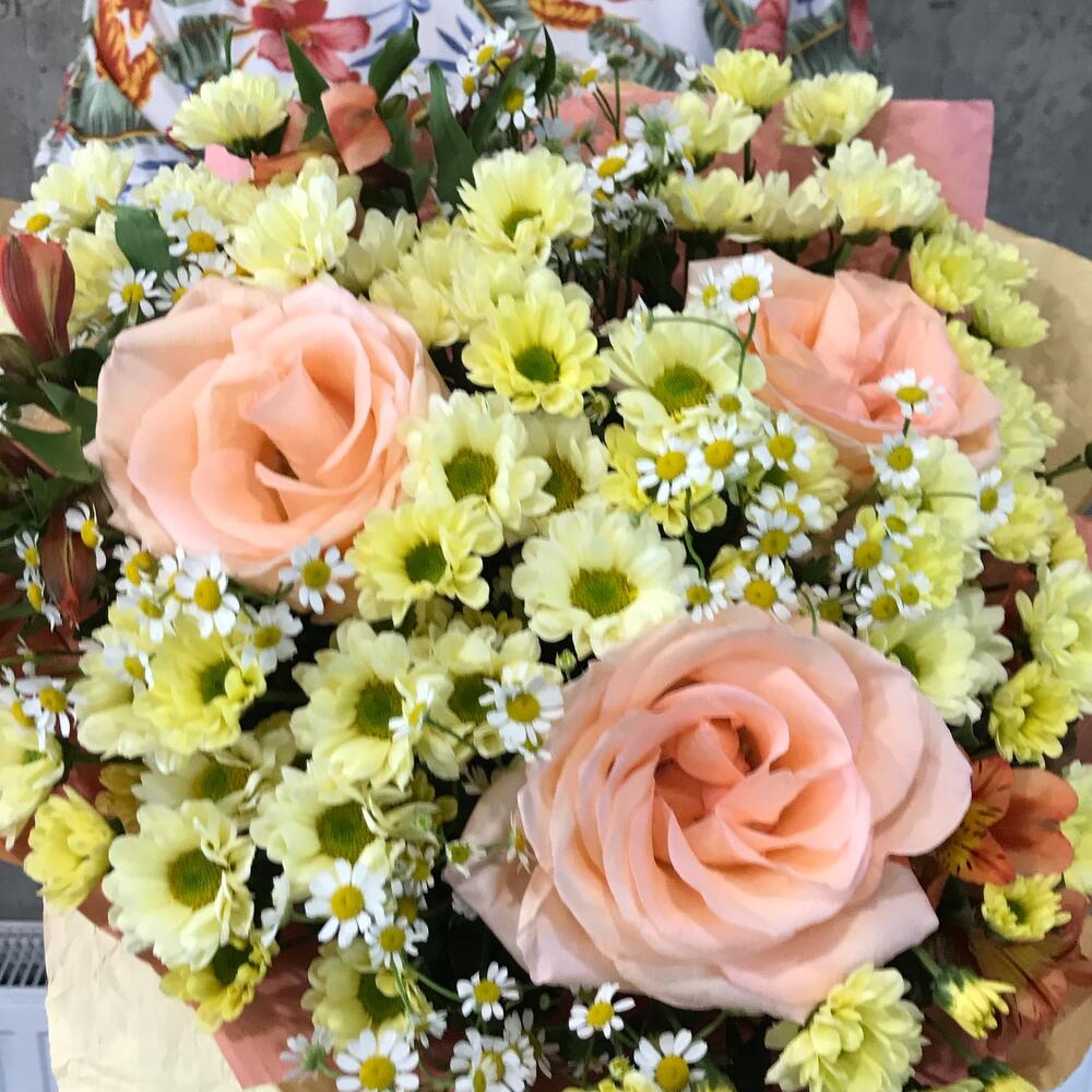 Хризантема кустовая – 8 шт.Роза – 3 шт.Альстромерия – 3 шт.Мантрикария – 5 шт.Крафт – 3 шт.Атласная лента – 1 шт.