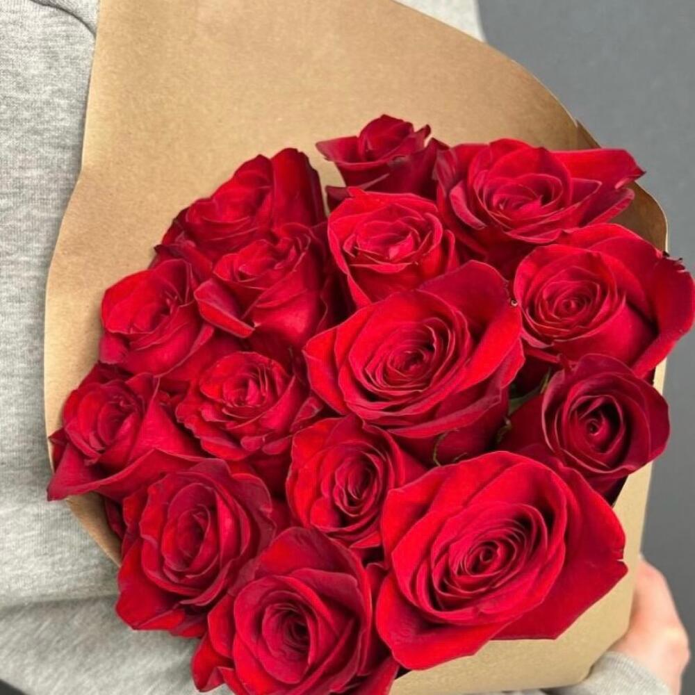 Роза красная 60 см – 15 шт.Крафт упаковка – 2 шт.Лента атласная – 2 шт.