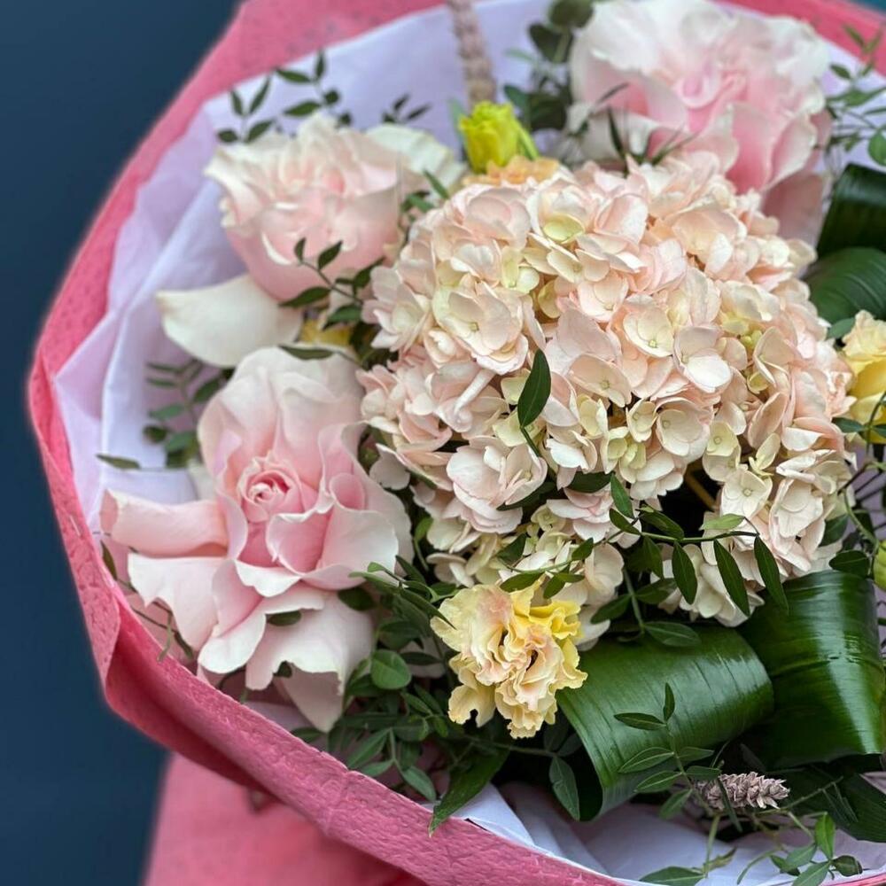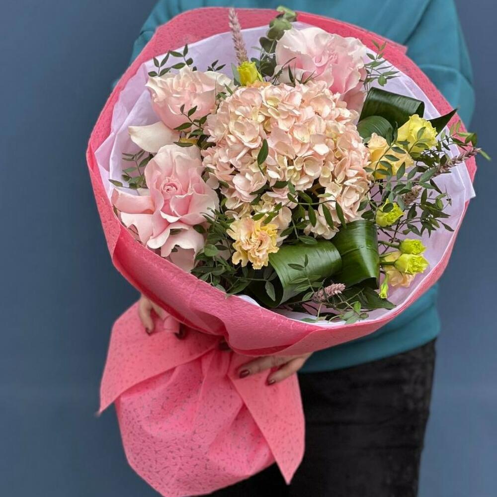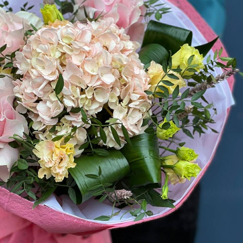 Гортензия – 1 шт. Роза голландия – 3 шт. Эустома – 3 шт. Аспидистра – 3 шт. Эвкалипт – 2 шт. Фисташка – 5 шт. Декор – 3 шт. Упаковка дизайнерская – 6 шт. Лента – 1 шт.