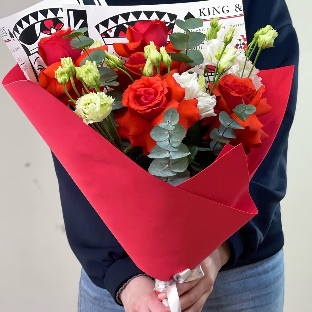 Роза Эквадор – 5 шт.Лизиантус Алиса белый – 4 шт.зелень декоративная – 1 шт.Упаковка дизайнерская – 1 шт.