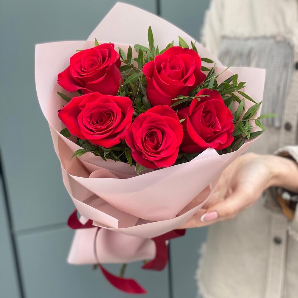 Букет из 5 красных роз и зелени в оформлении!