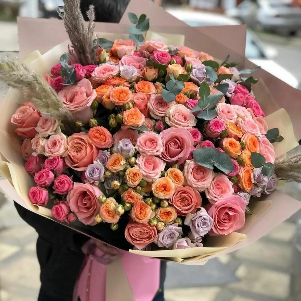 Альстромерии, Гвоздики, Кустовые розы, Лизиантусы, Розы, Хризантемы