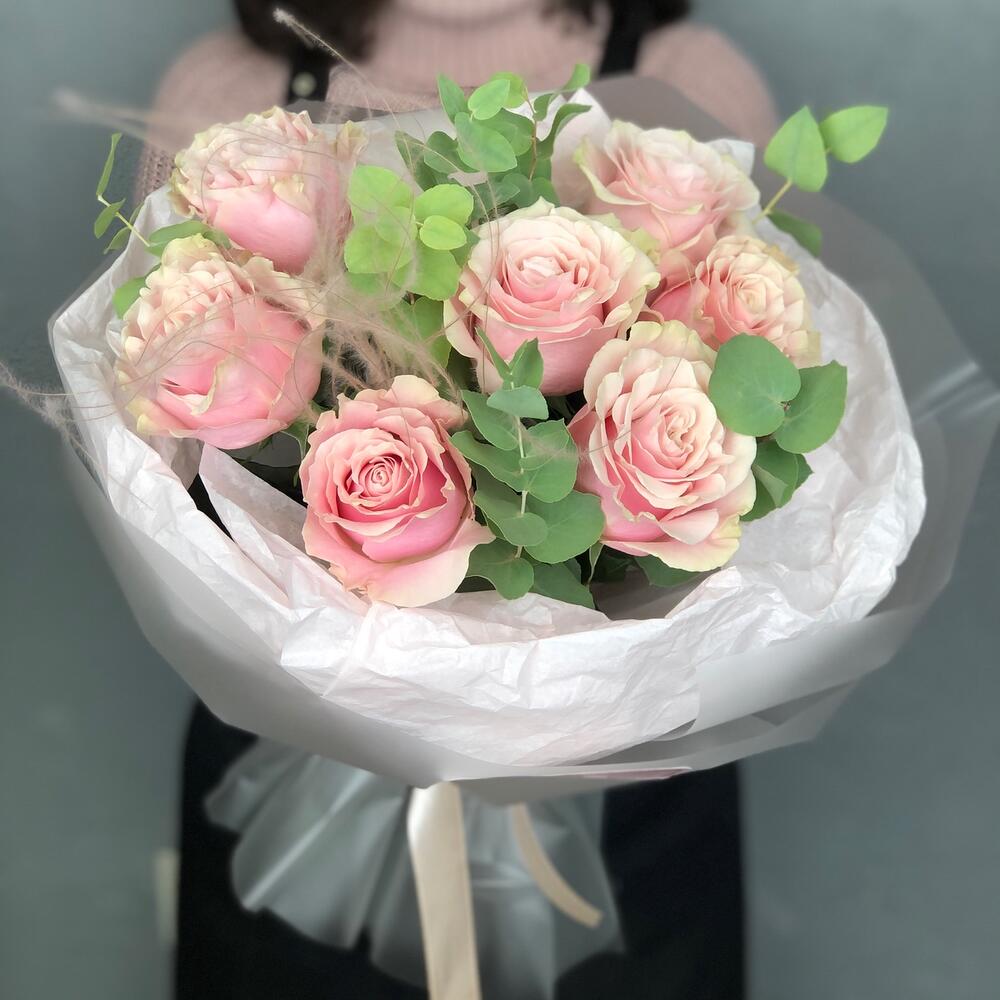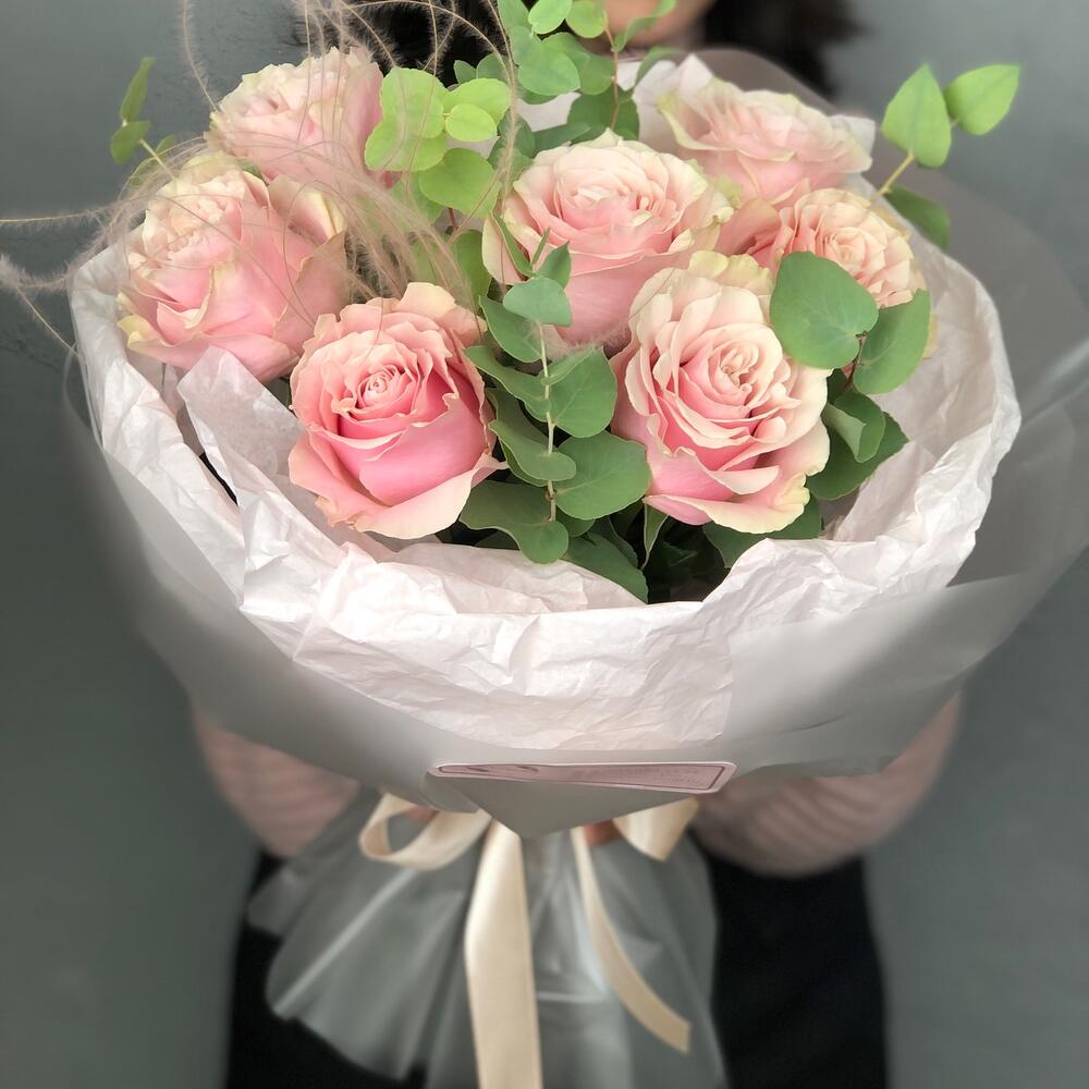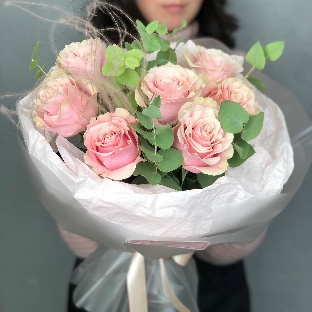 Эвкалипт – 2 шт.Упаковка дизайнерская – 2 шт.Ковыль – 1 шт.пинк мондиаль роза – 7 шт.