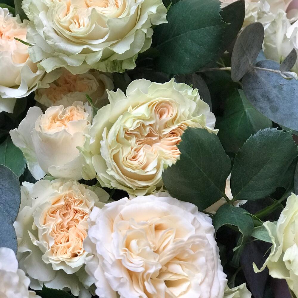 роза кустовая пионовидная саммер – 5 шт.эвкалипт цинерея пучок – 1 шт.Упаковка дизайнерская – 1 шт.
