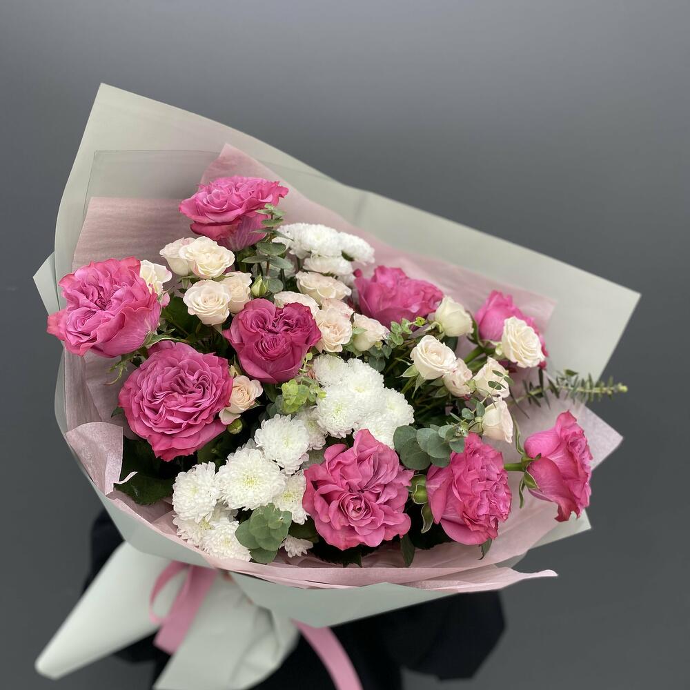 Гвоздики, Лизиантусы, Розы, Тюльпаны