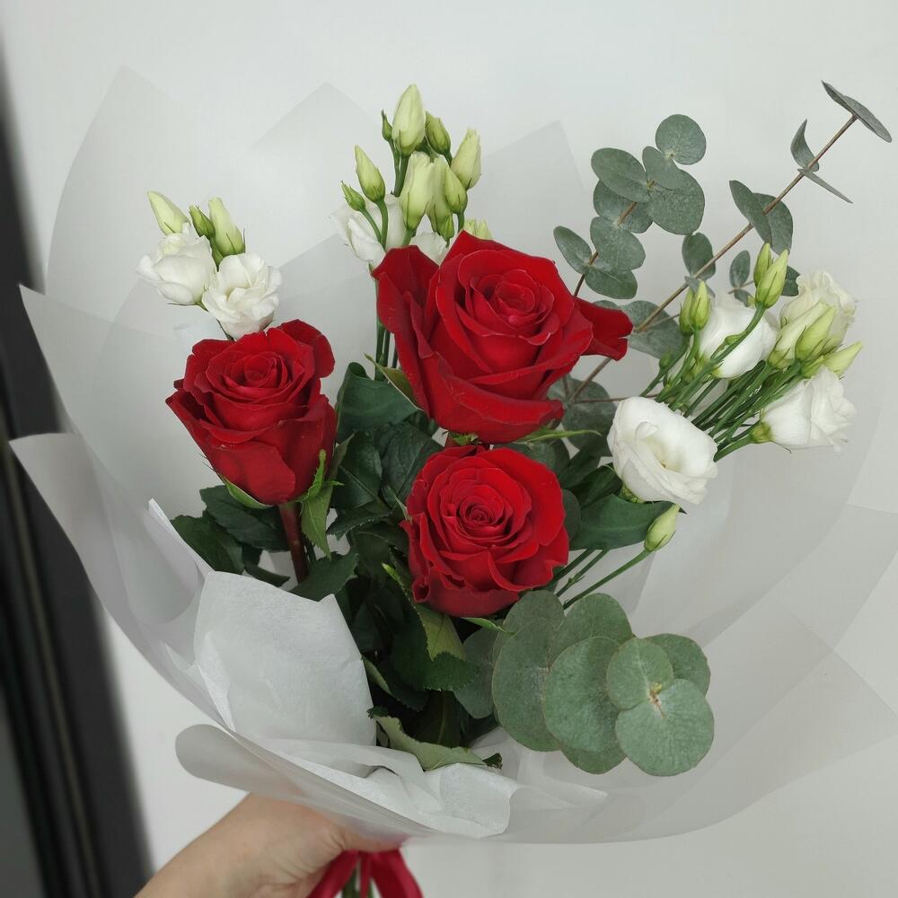 Эвкалипт – 2 шт.Роза – 3 шт.Эустома – 2 шт.Упаковка дизайнерская – 2 шт.