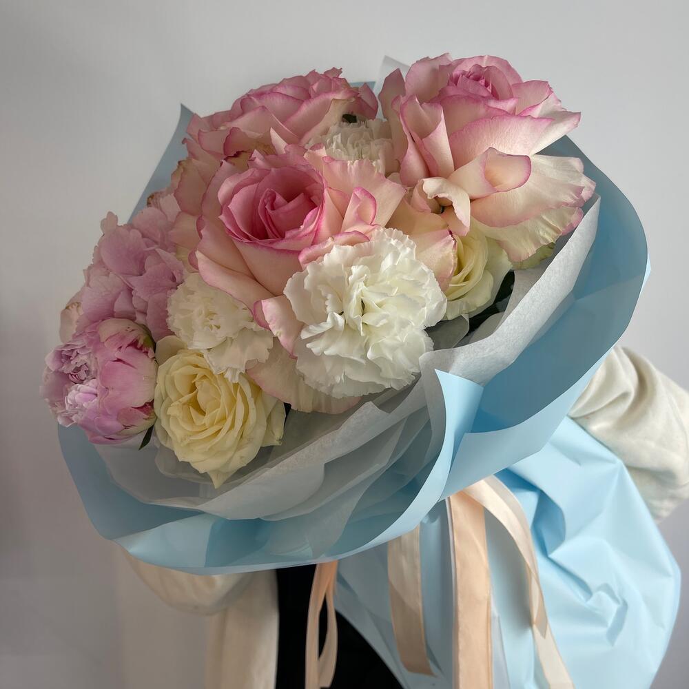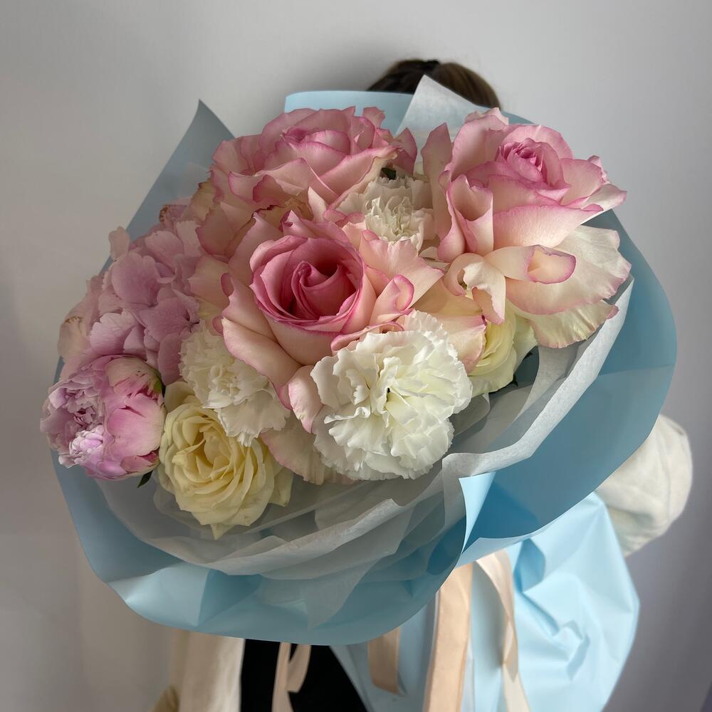 Гортензия – 1 шт.Пион – 1 шт.Роза – 3 шт.Диантус – 3 шт.Французская роза – 3 шт.