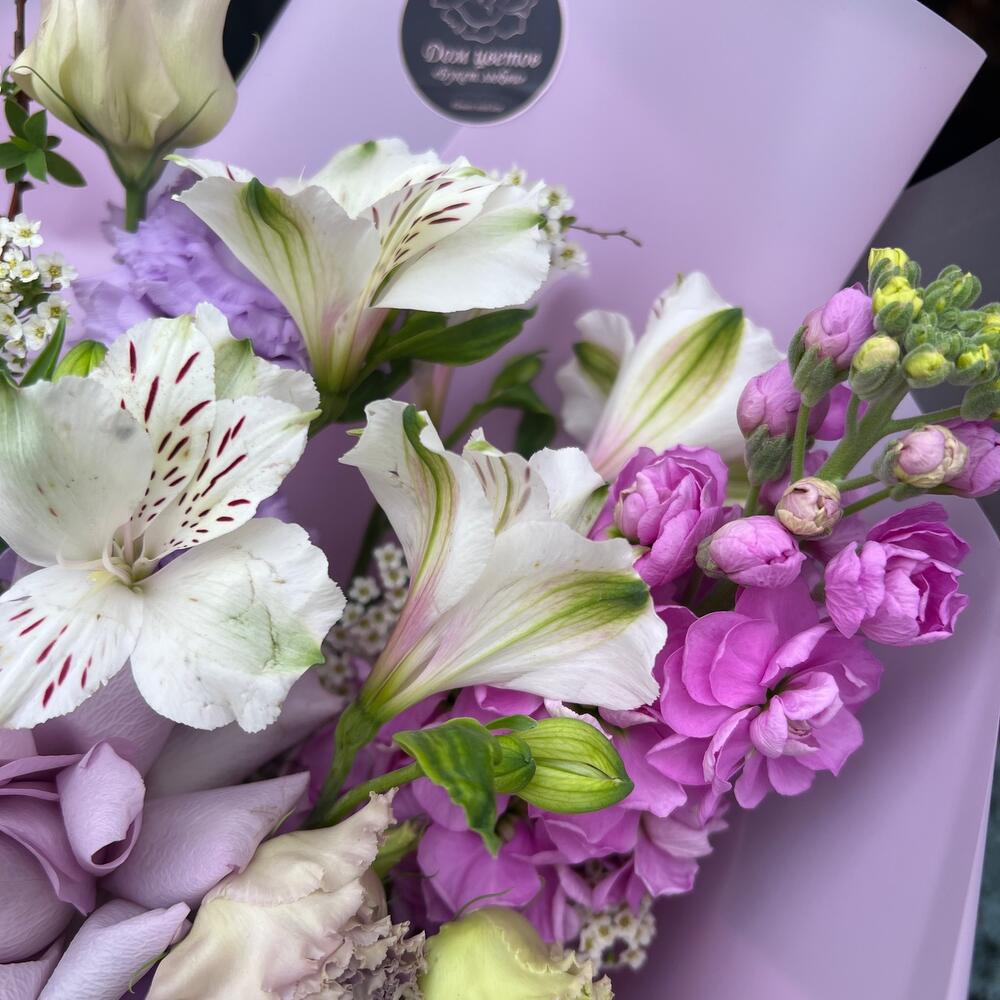 Альстромерия – 2 шт.Лизиантус – 4 шт.Маттиола – 2 шт.Пион – 1 шт.Роза – 3 шт.Кустовая роза – 2 шт.Атласная лента – 1 шт.декоративная упаковка – 1 шт.спирея ветка – 3 шт.