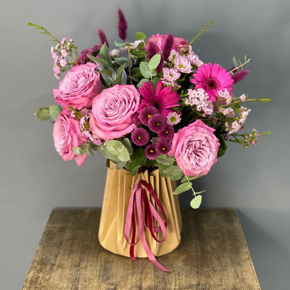 Ваксфлауэр – 3 шт.Лента – 2 шт.Рускус – 3 шт.Эвкалипт – 1 шт.Роза одноголовая – 7 шт.Гербера мини – 3 шт.Аквабокс – 1 шт.Пакет подарочный – 1 шт.Лагурус – 7 шт.хризантема сантини росси пинк – 2 шт.хризантема пурпетта – 3 шт.