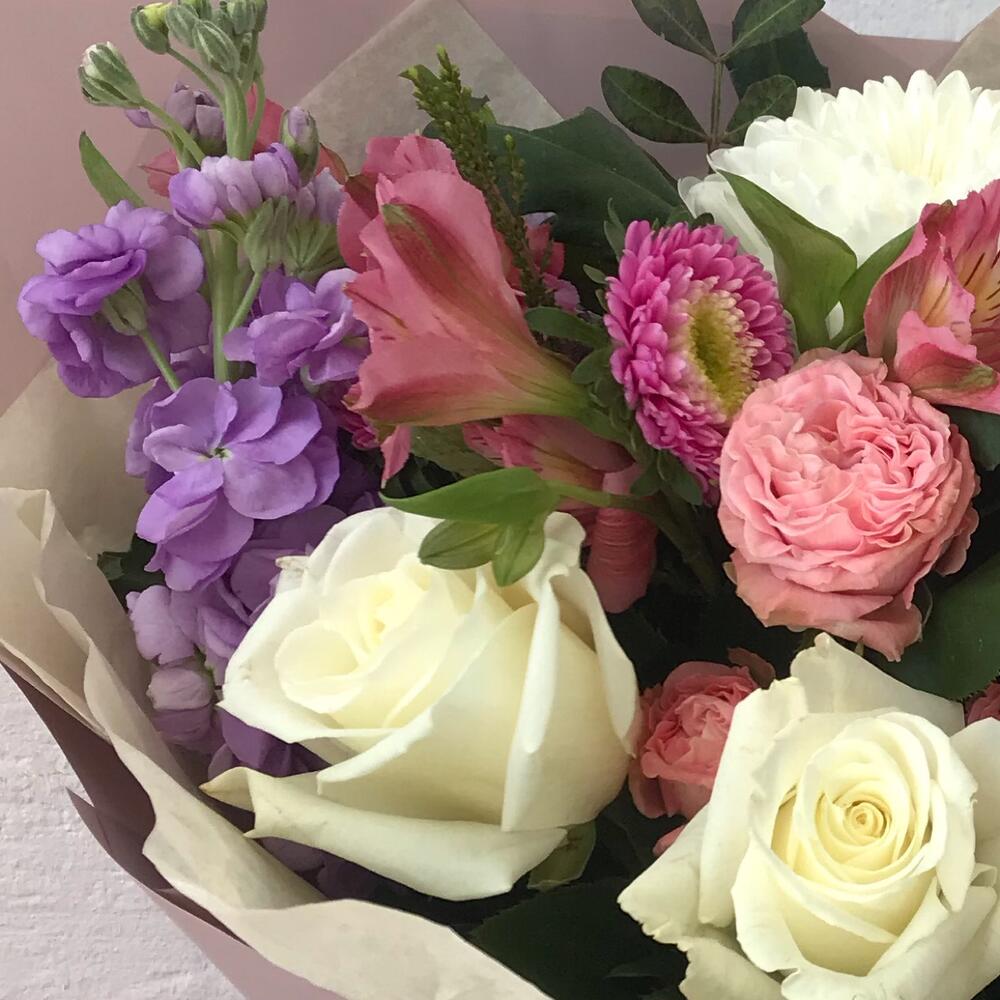 Роза белая 50 см – 3 шт.Маттиола – 2 шт.Альстромерия Микс Европа – 2 шт.Хризантема кустовая – 1 шт.Хризантема – 1 шт.Статица – 3 шт.зелень декоративная – 3 шт.Роза кустовая – 1 шт.Тишью – 1 шт.Упаковка дизайнерская – 3 шт.Лента атласная – 1 шт.