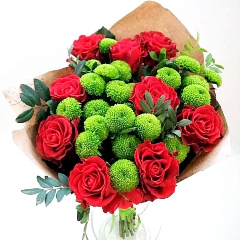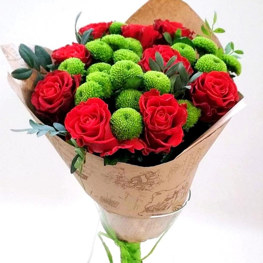 Состав: роза красная- 9 шт, хризантема зеленая- 4 шт, зелень фисташка- 2 ветки.