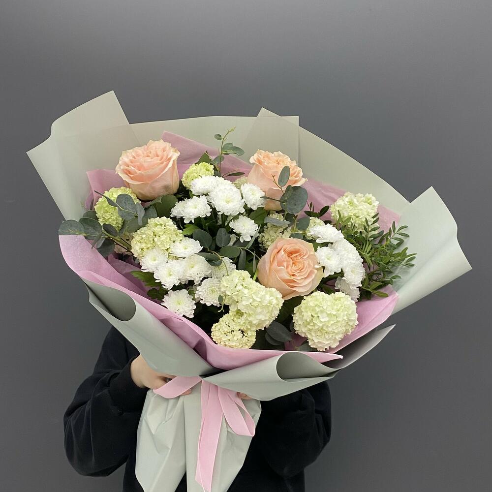 Альстромерии, Гортензии, Кустовые розы, Лизиантусы, Розы, Хризантемы