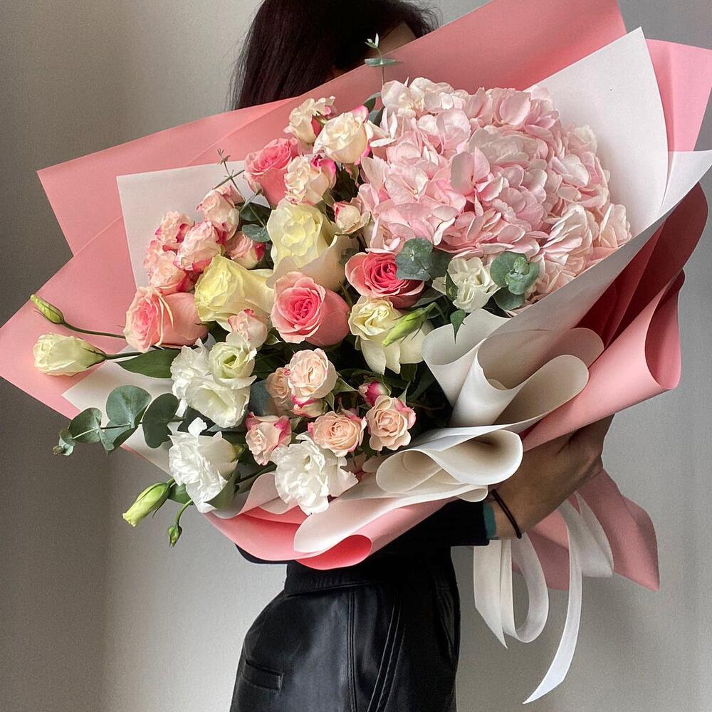 Альстромерии, Гортензии, Кустовые розы, Лизиантусы, Розы, Хризантемы