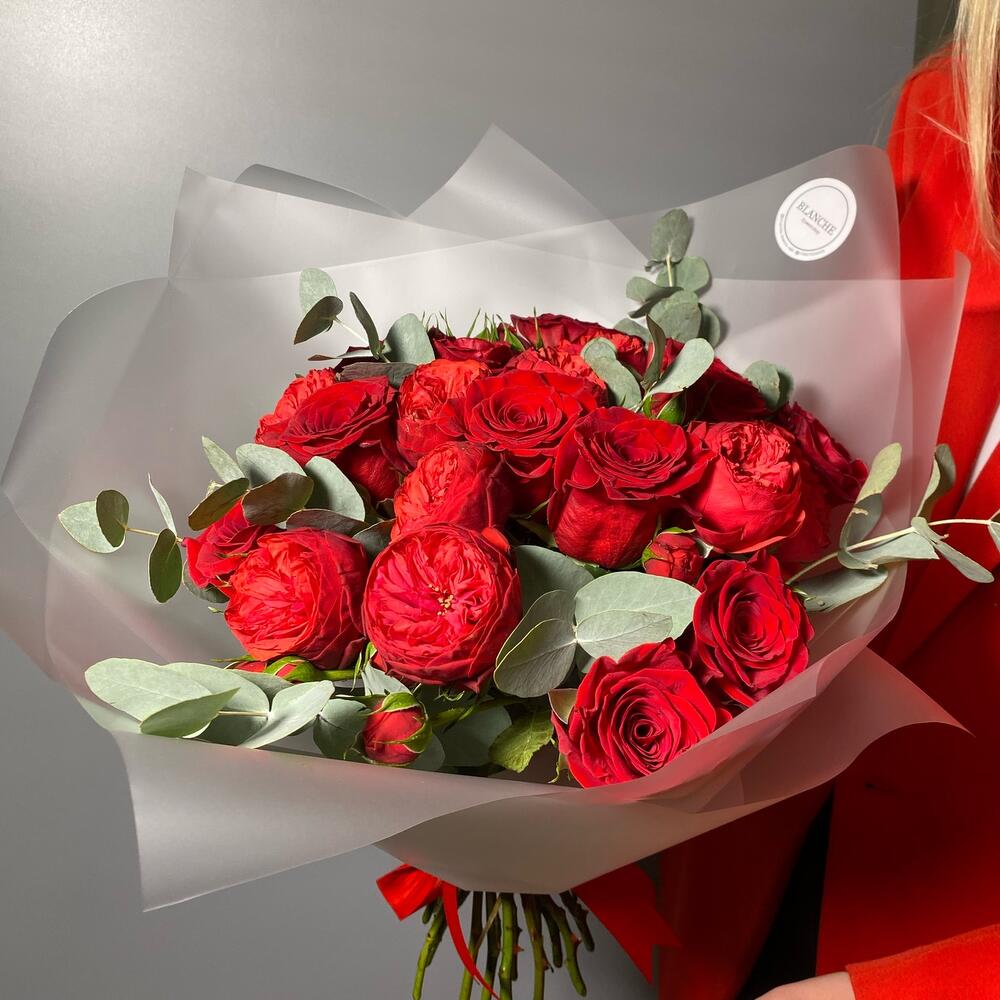 Эвкалипт – 5 шт.Роза Freedom – 12 шт.Фирменная упаковка – 1 шт.Роза red piano – 10 шт.