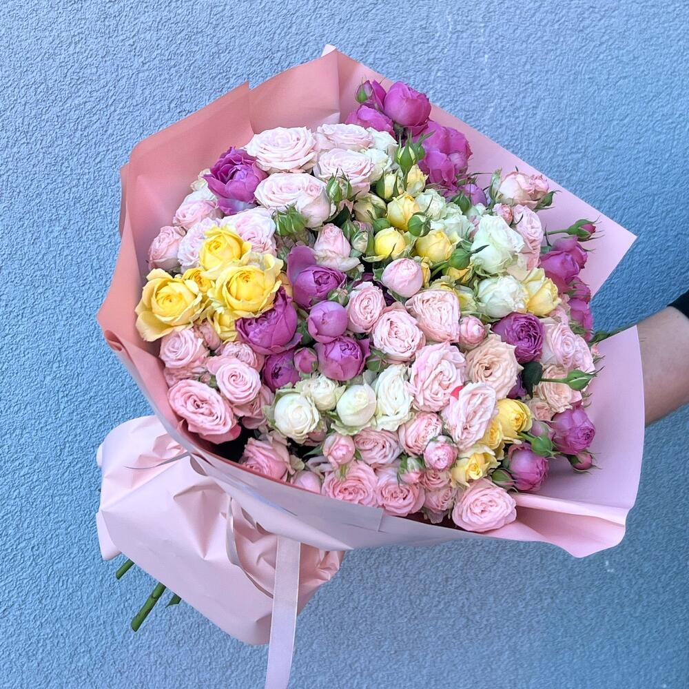 Спрей роза – 61 шт. Подсолнух – 3 шт. Упаковка дизайнерская – 3 шт. Атласная лента – 1 шт. Открыточка с вашими пожеланиями – 1 шт.