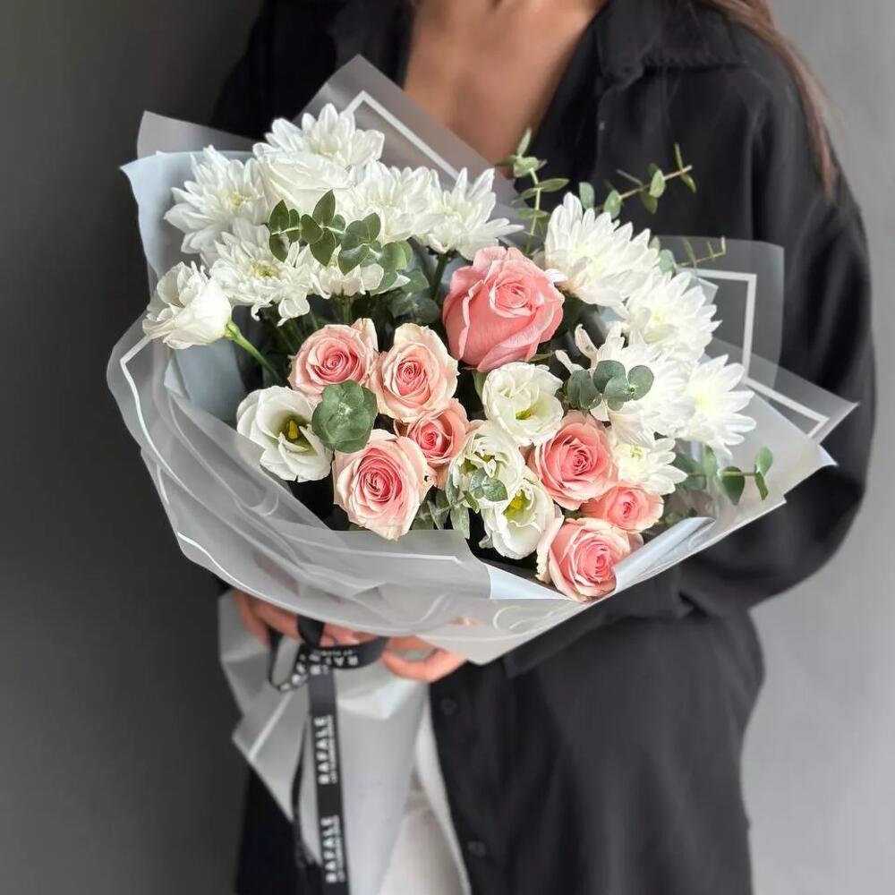 Сборный букет "EURO 13.0" состоит из 2 кустовых хризантем, 2 спрей роз, 1 голландской розы, 1 лизиантуса и 1 ветки эвкалипта в оформлении. Данный букет очень стильное напоминание о том, как дорог для Вас человек. Выбрав букет от RAFALE, Вы скрасите день обладательницы букета и подарите ей незабываемые эмоции.