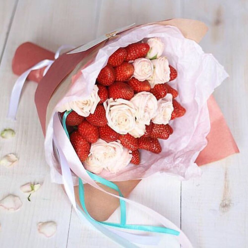 Оригинальный Фруктовый букет с кустовой розой и клубникойДиаметр букета – 25 смСостав: клубника, кустовые розыБесплатная Доставка в пределах КАД