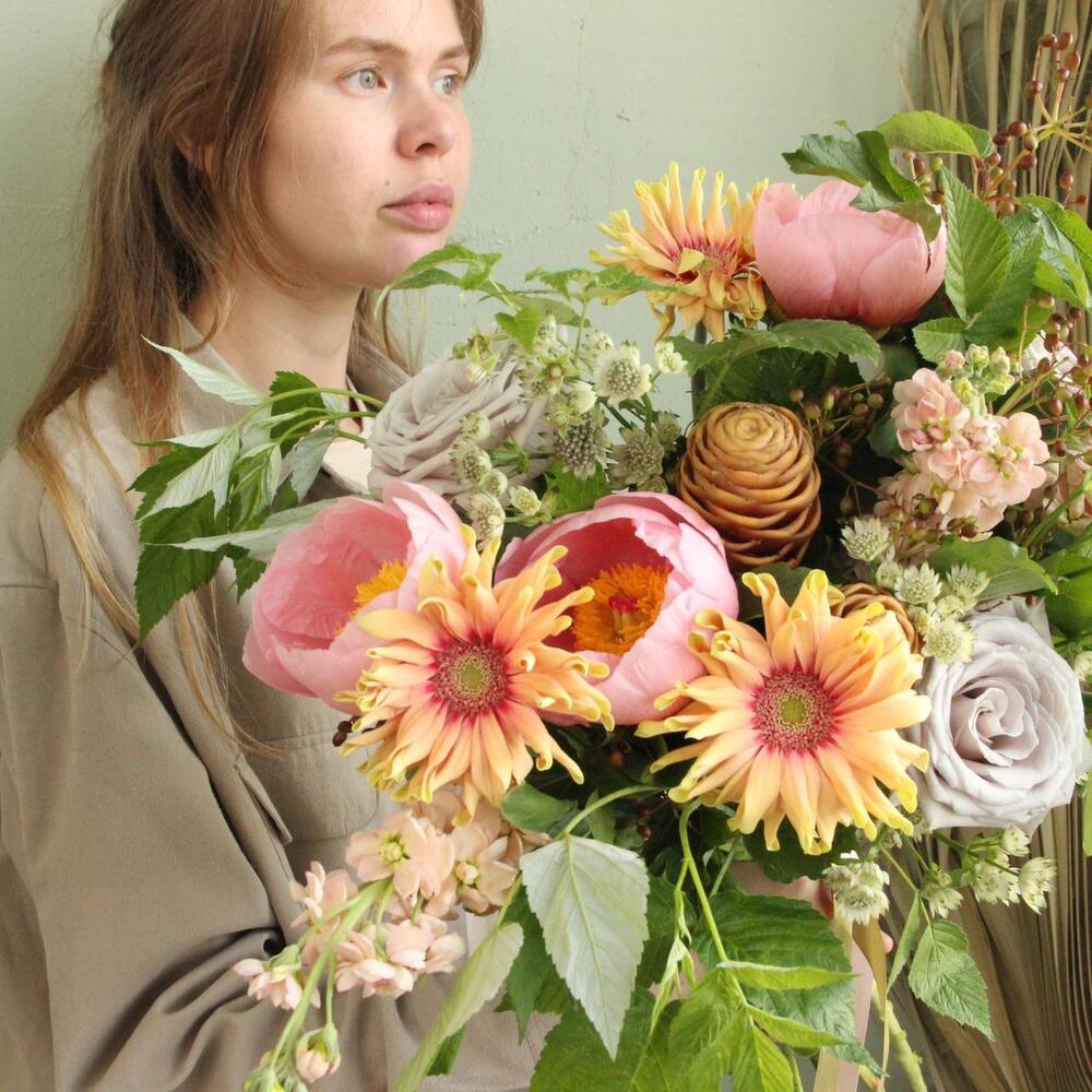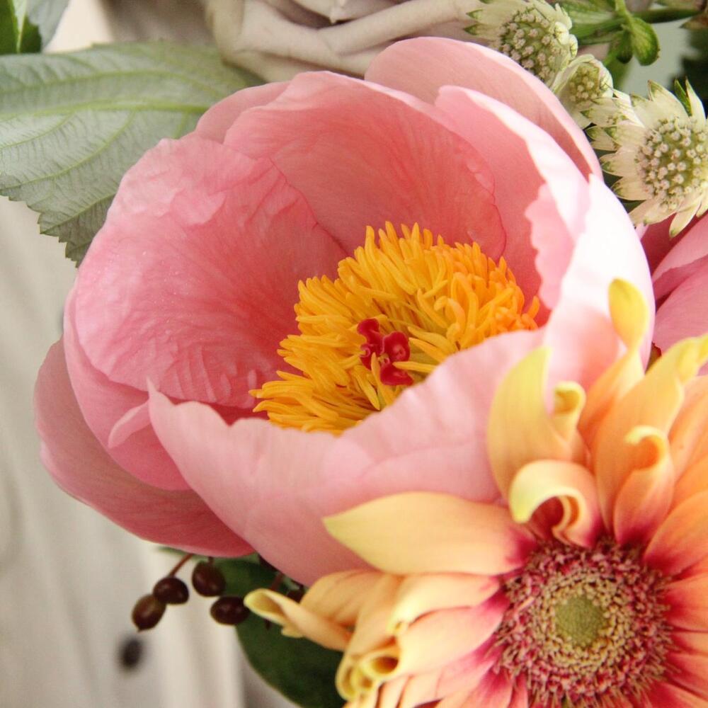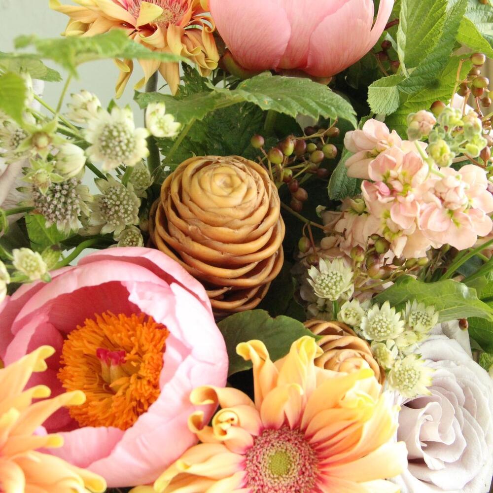 Имбирь – 2 шт.Пион – 3 шт.гербера кудрявая – 3 шт.Роза сортовая – 3 шт.Астранция – 3 шт.Маттиола – 3 шт.Вибурнум – 2 шт.Ветки малины – 5 шт.Лента атласная – 2 шт.