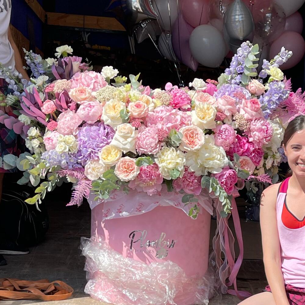 Коробка шляпная – 1 шт.Оазис флористический – 15 шт.Зелень – 10 шт.Пионовидная роза – 20 шт.Кустовая роза – 10 шт.хртзанткма кустовая – 10 шт.Гвоздика – 10 шт.Пион – 10 шт.Гортензия – 5 шт.Дельфиниум – 5 шт.Эустома – 10 шт.Хризантема – 10 шт.