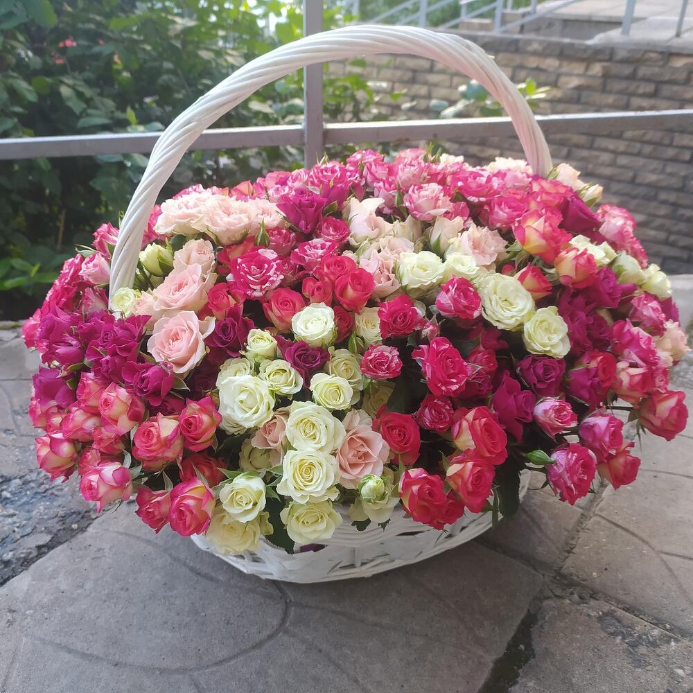 Роза кустовая – 101 шт.Корзина плетеная – 1 шт.Оазис флористический – 2 шт.