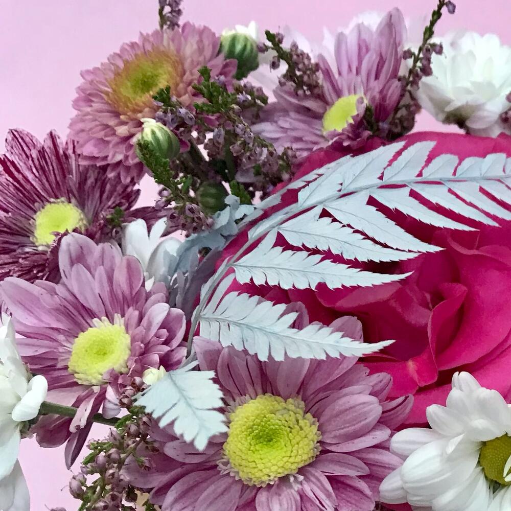 Роза Эквадор – 1 шт.Хризантема кустовая – 2 шт.вереск или лимониум – 3 шт.зелень декоративная – 1 шт.папоротник стабилизированный – 1 шт.Оазис флористический – 1 шт.крафтовый пакет – 1 шт.Лента атласная – 1 шт.