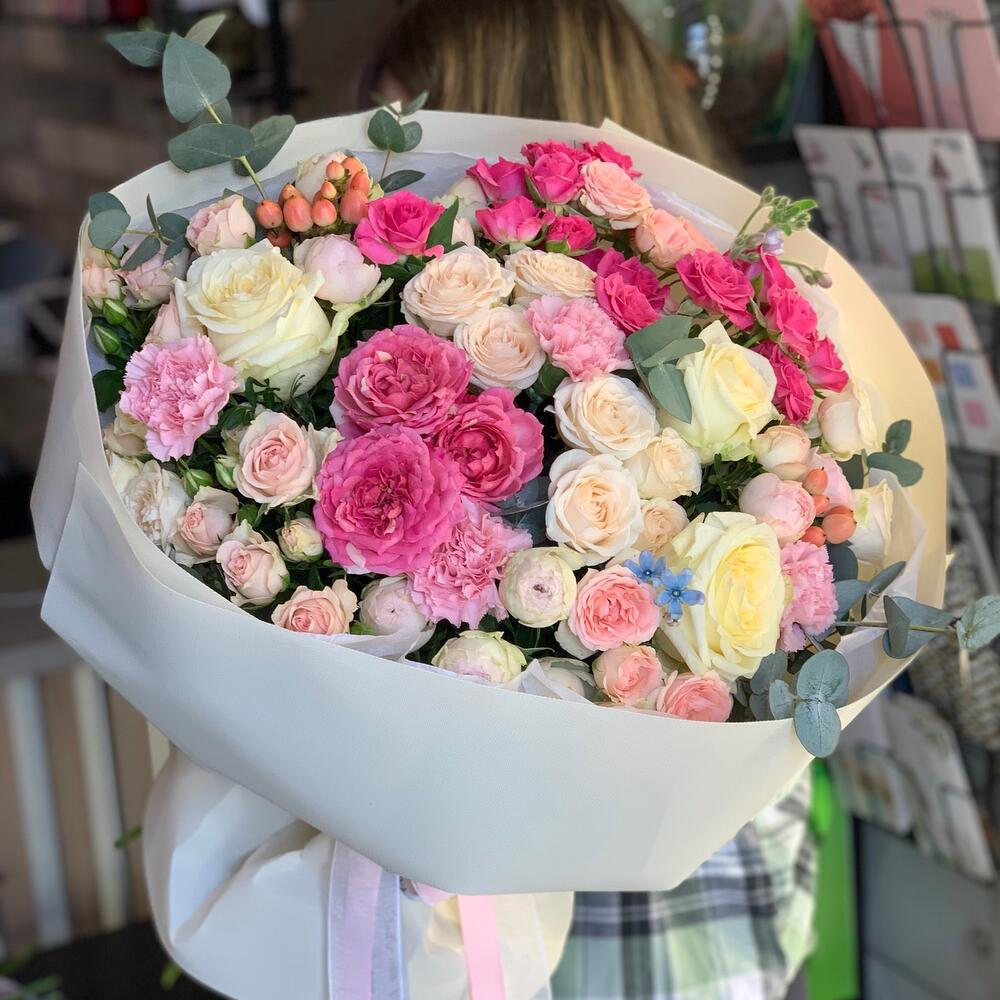 Роза – 3 шт.Кустовая роза – 5 шт.Пионовидная роза – 5 шт.Лизиантус – 4 шт.Хризантема – 5 шт.Эвкалипт – 1 шт.