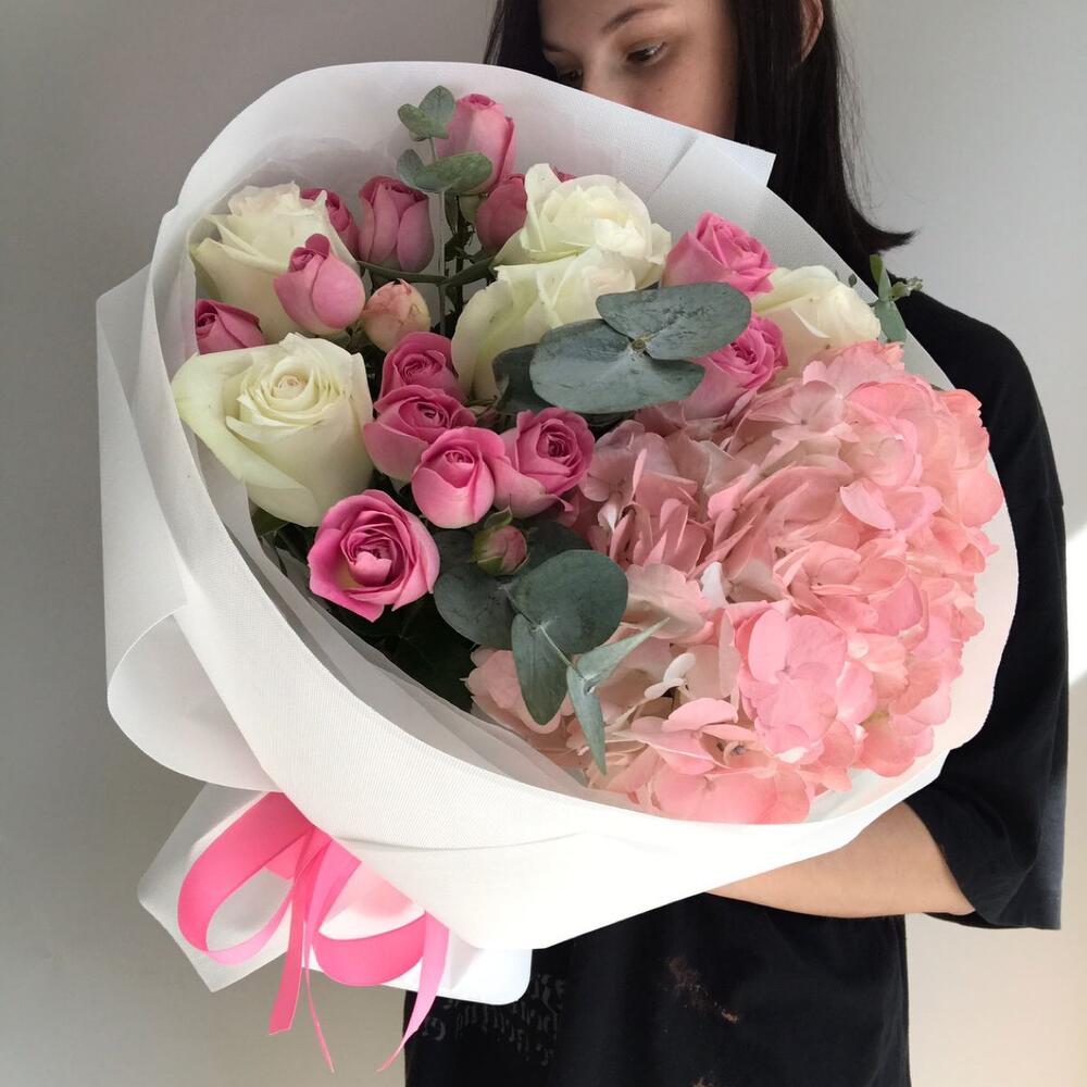 Альстромерии, Гортензии, Кустовые розы, Лизиантусы, Розы, Хризантемы