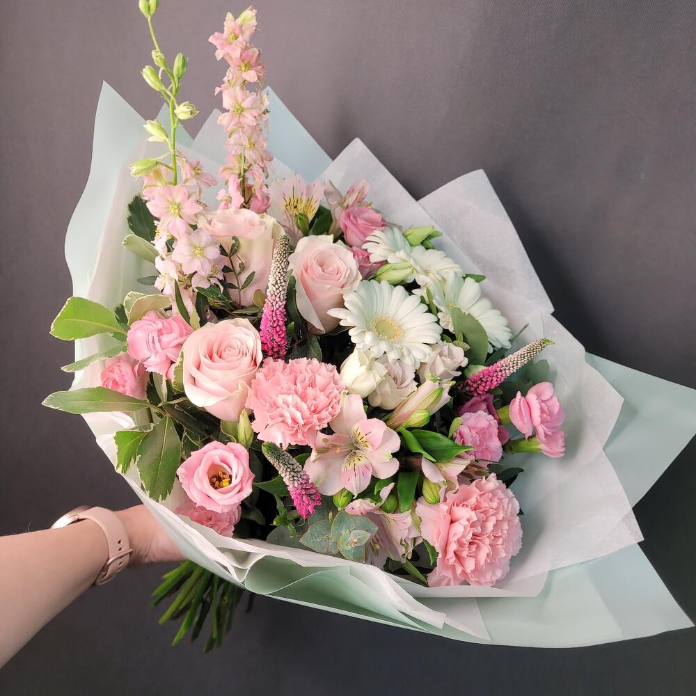 Роза Эквадор – 3 шт.Гербера – 3 шт.Вероника – 3 шт.Диантус – 3 шт.Альстромерия – 2 шт.Лизиантус – 1 шт.Дельфиниум – 2 шт.Диантус кустовой – 2 шт.Питтоспорум – 3 шт.Фисташка – 2 шт.Упаковка дизайнерская – 1 шт.Лента атласная – 1 шт.