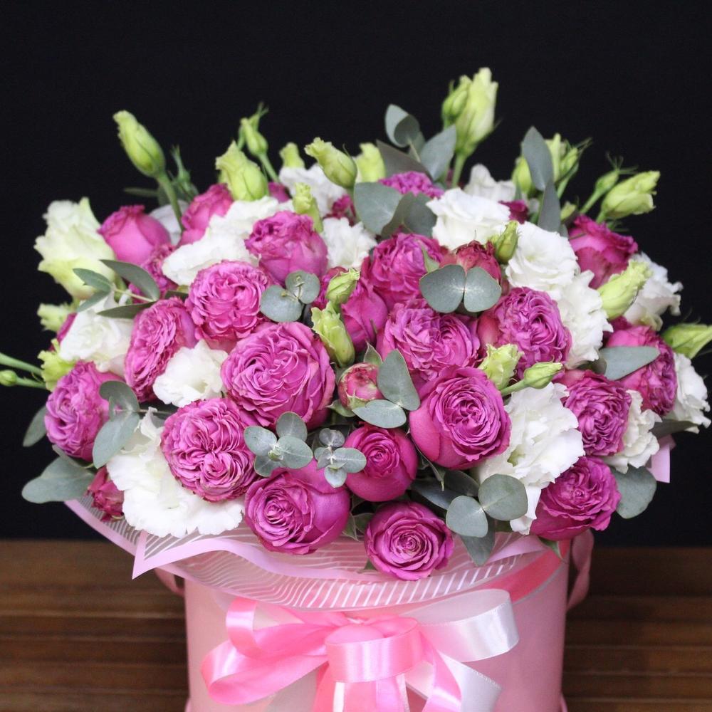 Роза пионовидная – 9 шт.Эустома – 6 шт.Эвкалипт – 5 шт.Пленка дизайнерская – 1 шт.Оазис флористический – 1 шт.Шляпная коробка – 1 шт.