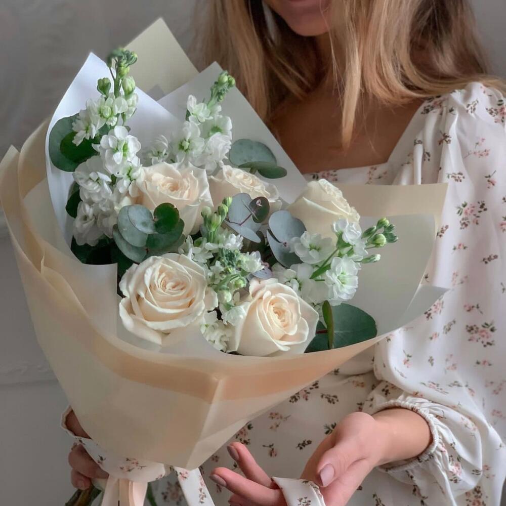 Маттиола белая – 4 шт.роза плая бланка – 5 шт.Эвкалипт Микс – 2 шт.Упаковка дизайнерская – 1 шт.