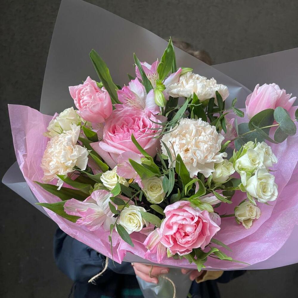 Гвоздика кремовая – 3 шт.Эвкалипт – 1 шт.Упаковка – 3 шт.Фисташка – 4 шт.Альстромерия розовая – 3 шт.Тюльпан розовый пионовидный – 3 шт.роза pink o’hara – 1 шт.роза кустовая белая (40 см) – 3 шт.