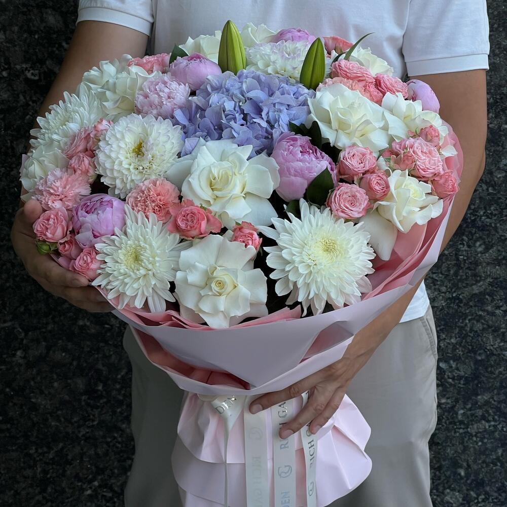 Категорий: Гвоздики, Георгины, Гортензии, Лилии, Пионовидные розы, Пионы, Розы, Хризантемы