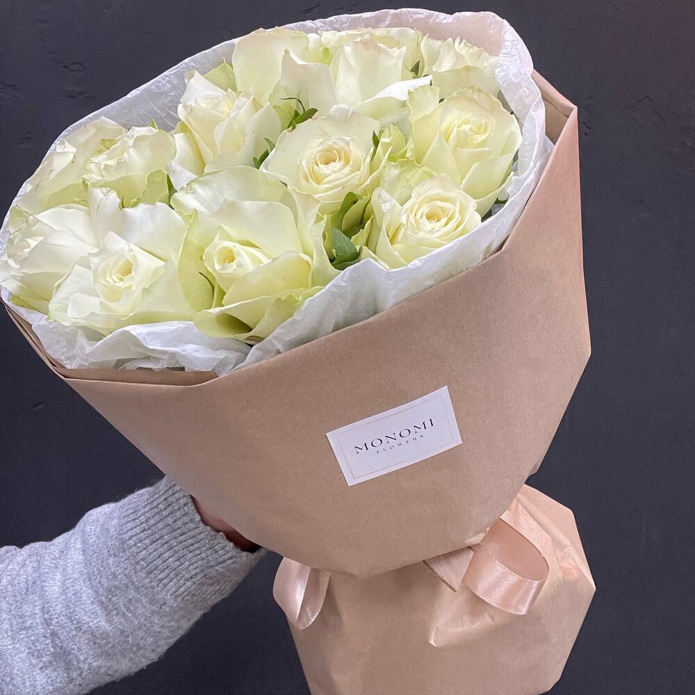 роза кения – 13 шт.Упаковка дизайнерская – 2 шт.Лента атласная – 1 шт.наклейка фирменная – 1 шт.
