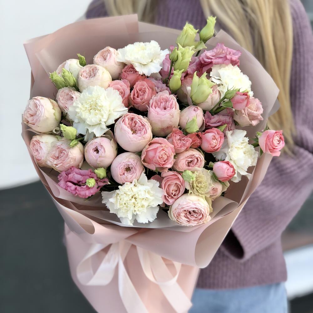 Гвоздики, Кустовые розы, Лизиантусы, Пионовидные розы, Розы