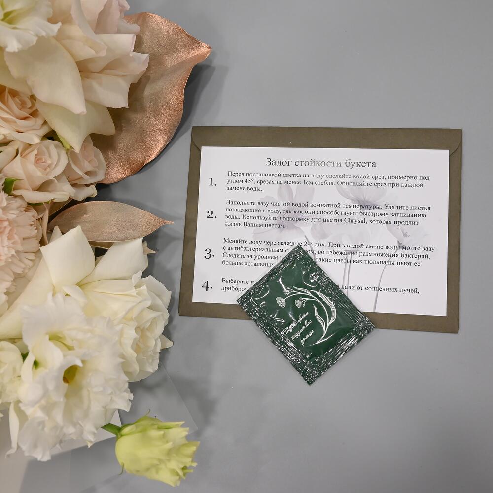 Пастельный букет в бело кремовой цветовой гамме. В составе французские розы, листья магнолии, кустовая роза и лизиантус.Флористы студии Цветочный Этикет собрали его из самых свежих цветов, тщательно продумав состав. Букет готов удивлять красотой своего получателя! Станет … Показать ещёидеальным подарком для любимой женщины, дочке или мамы, на День Рождения, юбилей, свадьбу и другие торжественные мероприятия. С букетом вы получите конверт с открыткой, в которой мы напишем любое пожелание, инструкцию свежести и средство для продления жизни срезанных цветов.