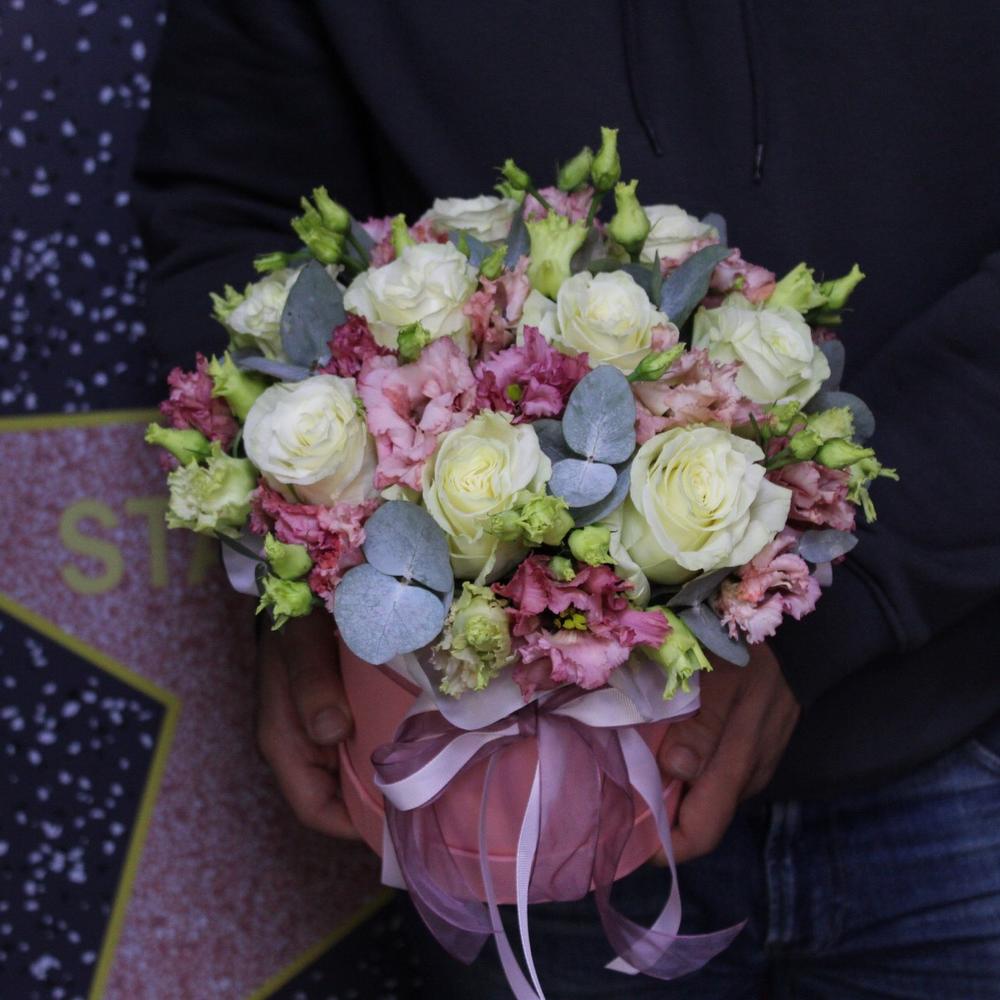 Роза Мондиаль – 9 шт.эустома махровая – 5 шт.Эвкалипт – 2 шт.Пленка дизайнерская – 1 шт.Оазис флористический – 1 шт.Лента атласная – 2 шт.Шляпная коробка – 1 шт.