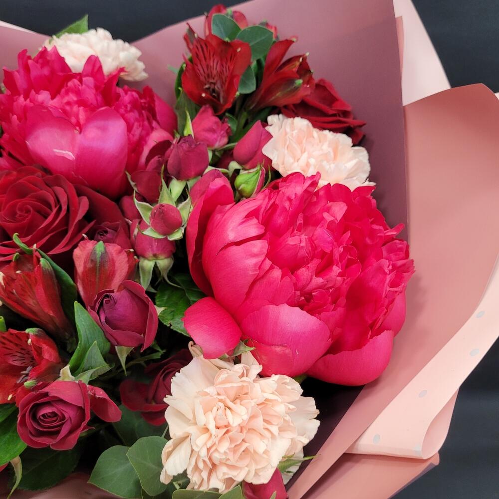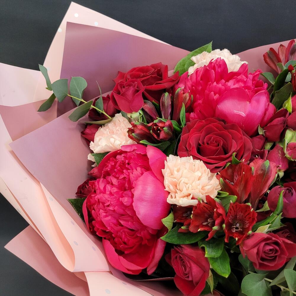 Альстромерии, Кустовые розы, Лизиантусы, Пионовидные розы, Розы, Ромашки