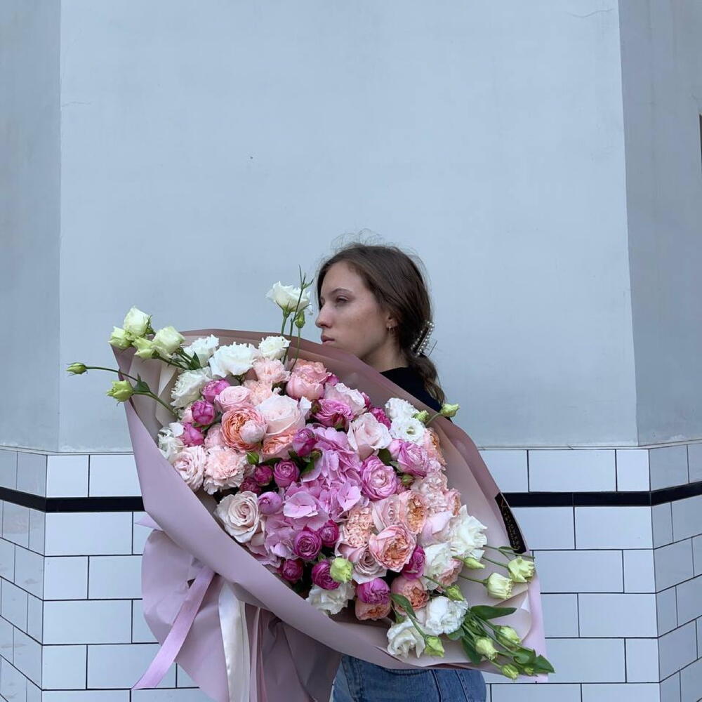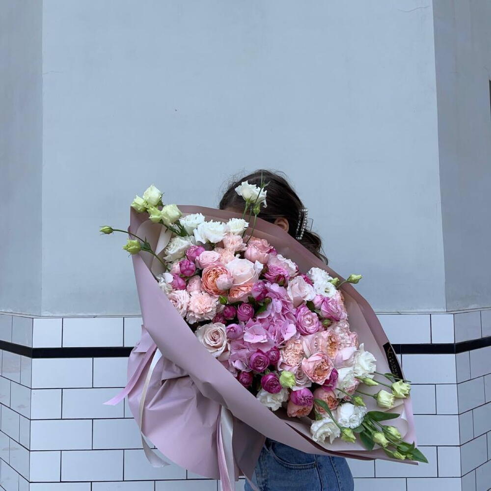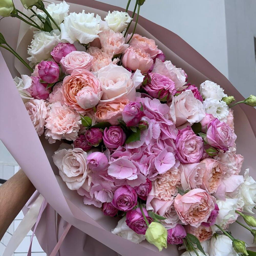 Альстромерии, Гортензии, Кустовые розы, Лизиантусы, Розы, Хризантемы