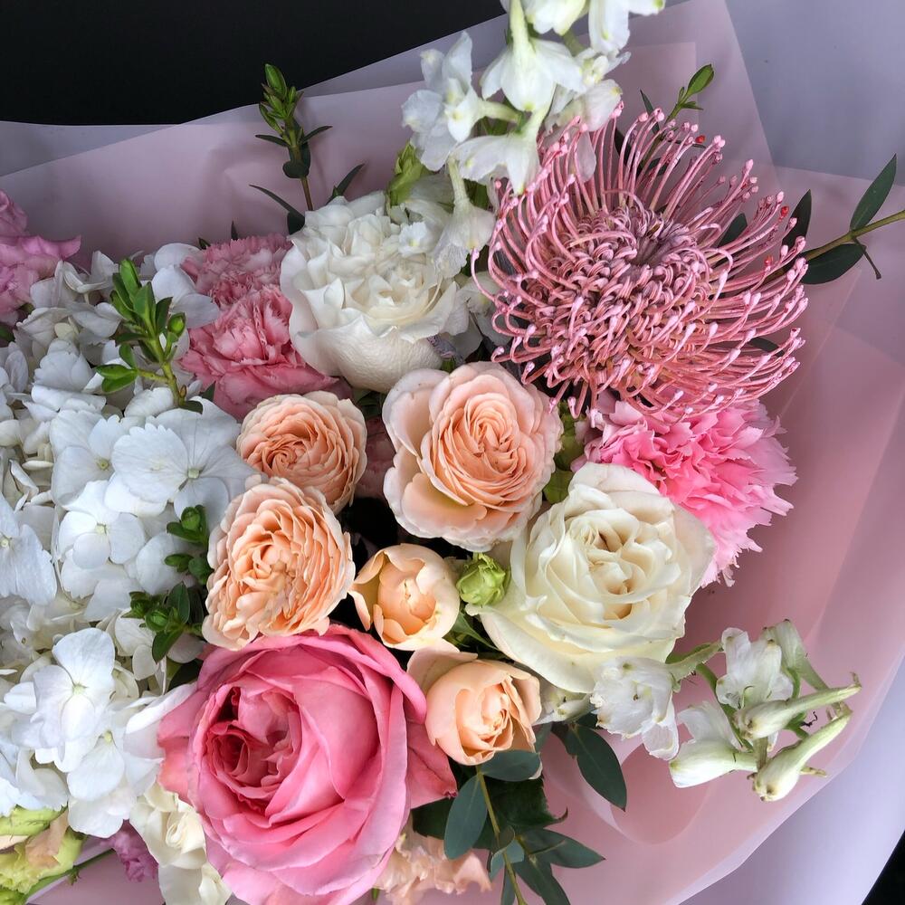 Гортензия белая – 1 шт.Дельфиниум белый – 3 шт.роза пионовидная пинк экспрешн – 2 шт.Роза Венделла – 3 шт.Кустовая роза – 1 шт.Эустома – 2 шт.леукоспермум розовый – 1 шт.Диантус – 3 шт.эвкалипт итальянский – 4 шт.Пленка матовая – 6 шт.Лента – 3 шт.