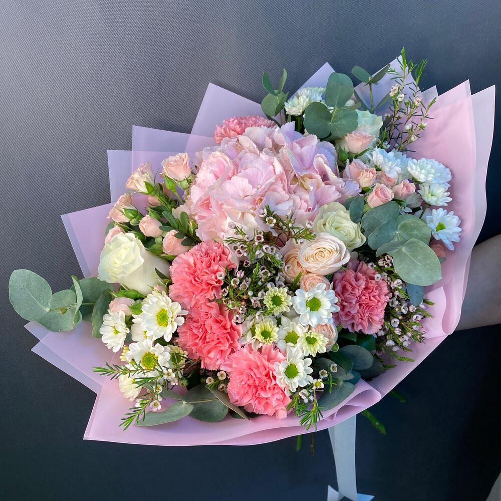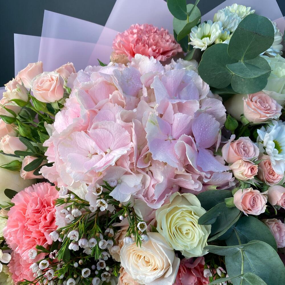 Гортензия розовая – 1 шт.Роза Эквадор – 3 шт.Роза кустовая – 3 шт.сантини ромашка кустовая – 4 шт.Диантус – 5 шт.Ваксфлауэр – 2 шт.Эвкалипт – 2 шт.зелень декоративная – 5 шт.Упаковка дизайнерская – 5 шт.