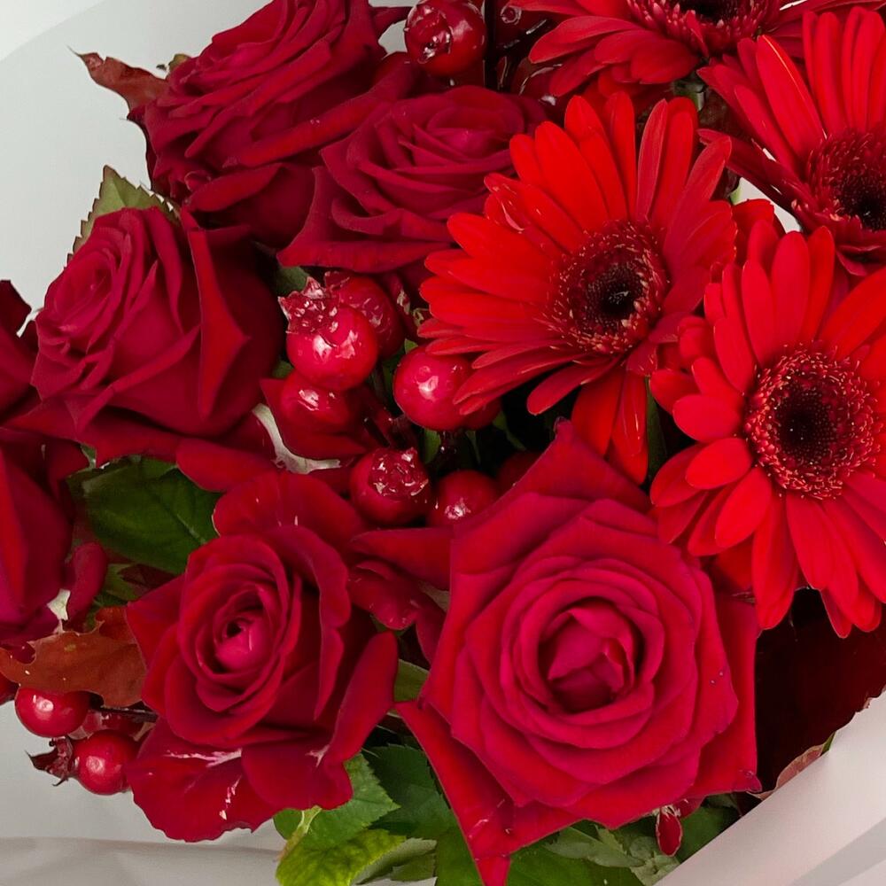 Роза – 6 шт.Гербера – 7 шт.Листья Дуба – 5 шт.Ягоды декоративные – 4 шт.Пленка матовая – 2 шт.