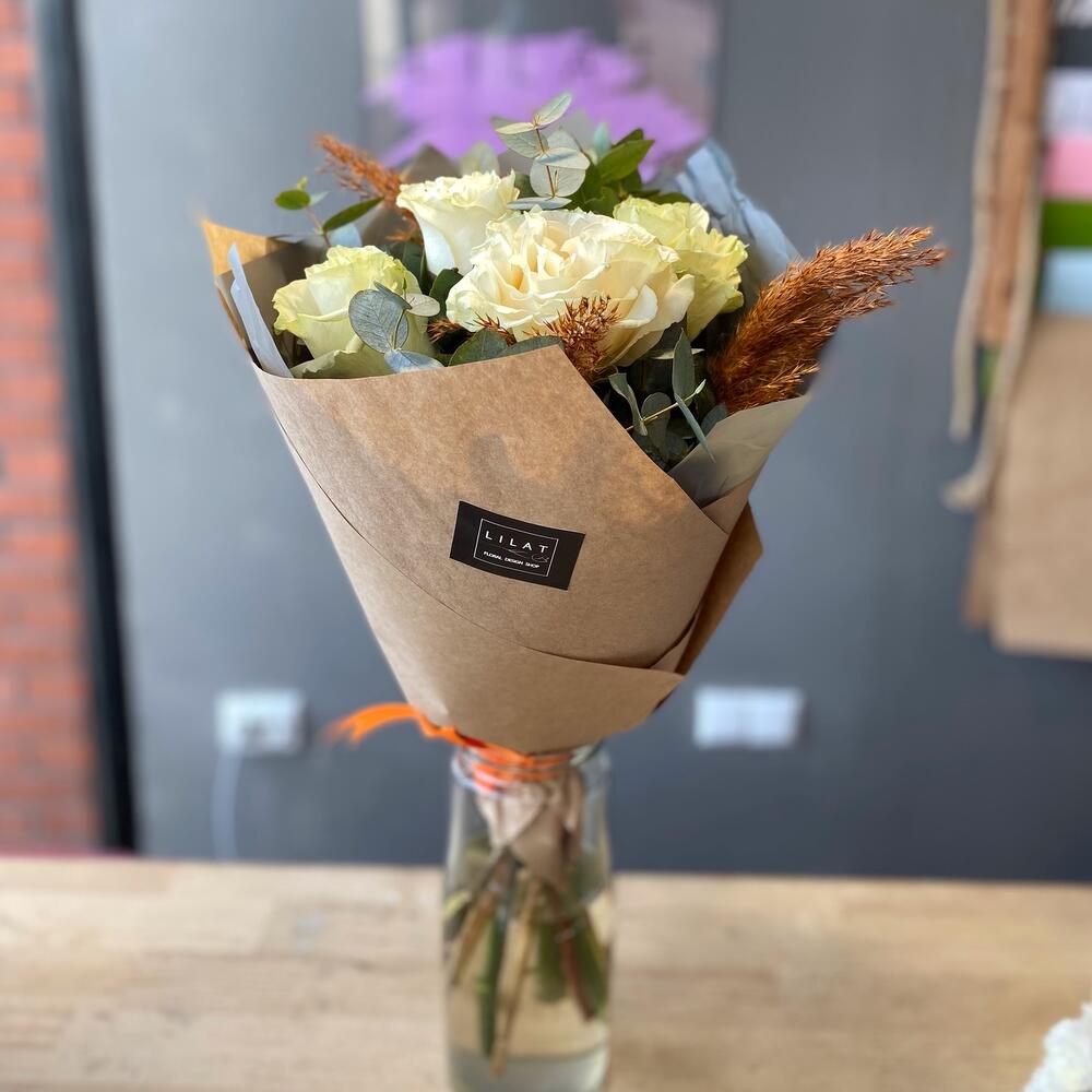 Эвкалипт – 3 шт. Крафт упаковка – 2 шт. Открыточка с вашими пожеланиями – 1 шт. розы – 5 шт.