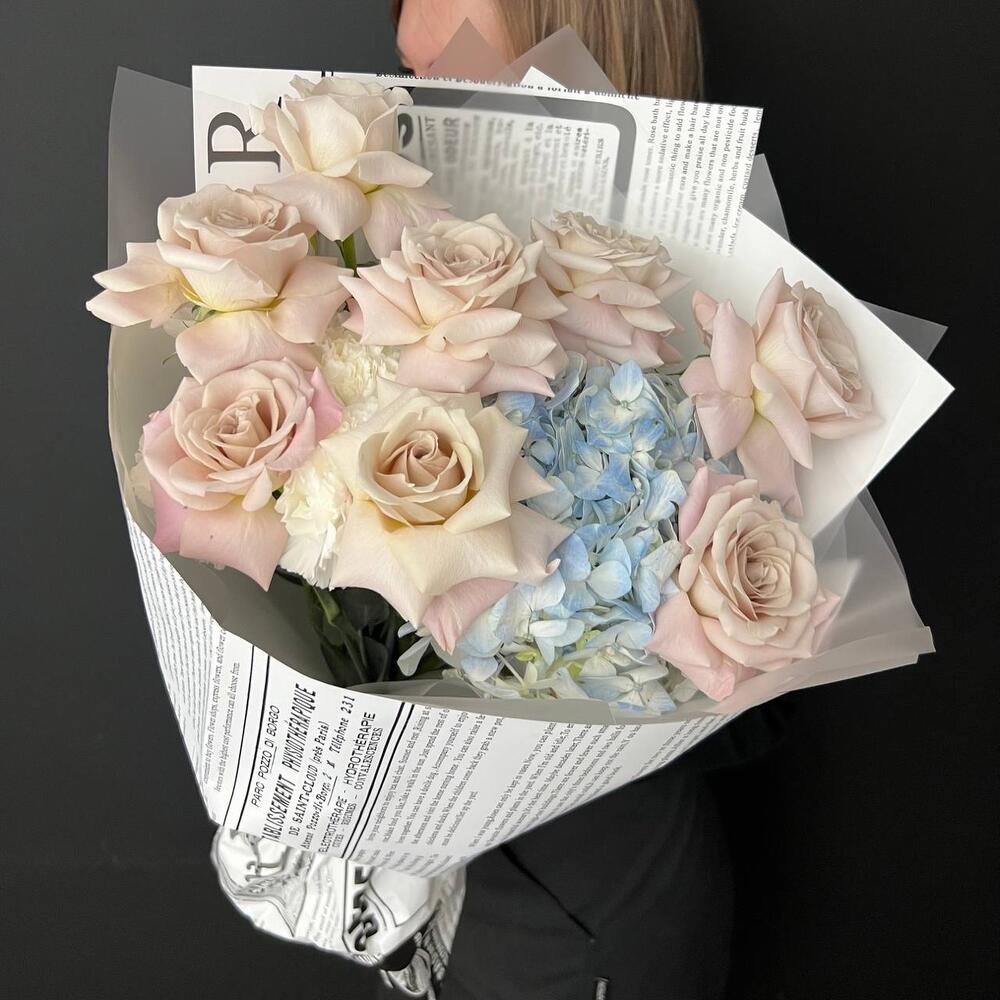 Альстромерии, Гвоздики, Кустовые розы, Лизиантусы, Розы, Хризантемы