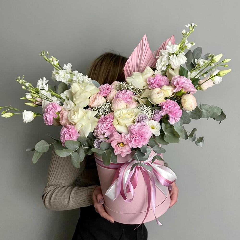 Маттиола – 4 шт.Лизиантус – 4 шт.Роза пионовидная кустовая – 5 шт.Роза – 5 шт.Озотамнус – 3 шт.Эвкалипт – 2 шт.Диантус – 9 шт.Роза кустовая – 1 шт.Лист пальмы – 2 шт.Оазис – 2 шт.Коробка шляпная – 1 шт.